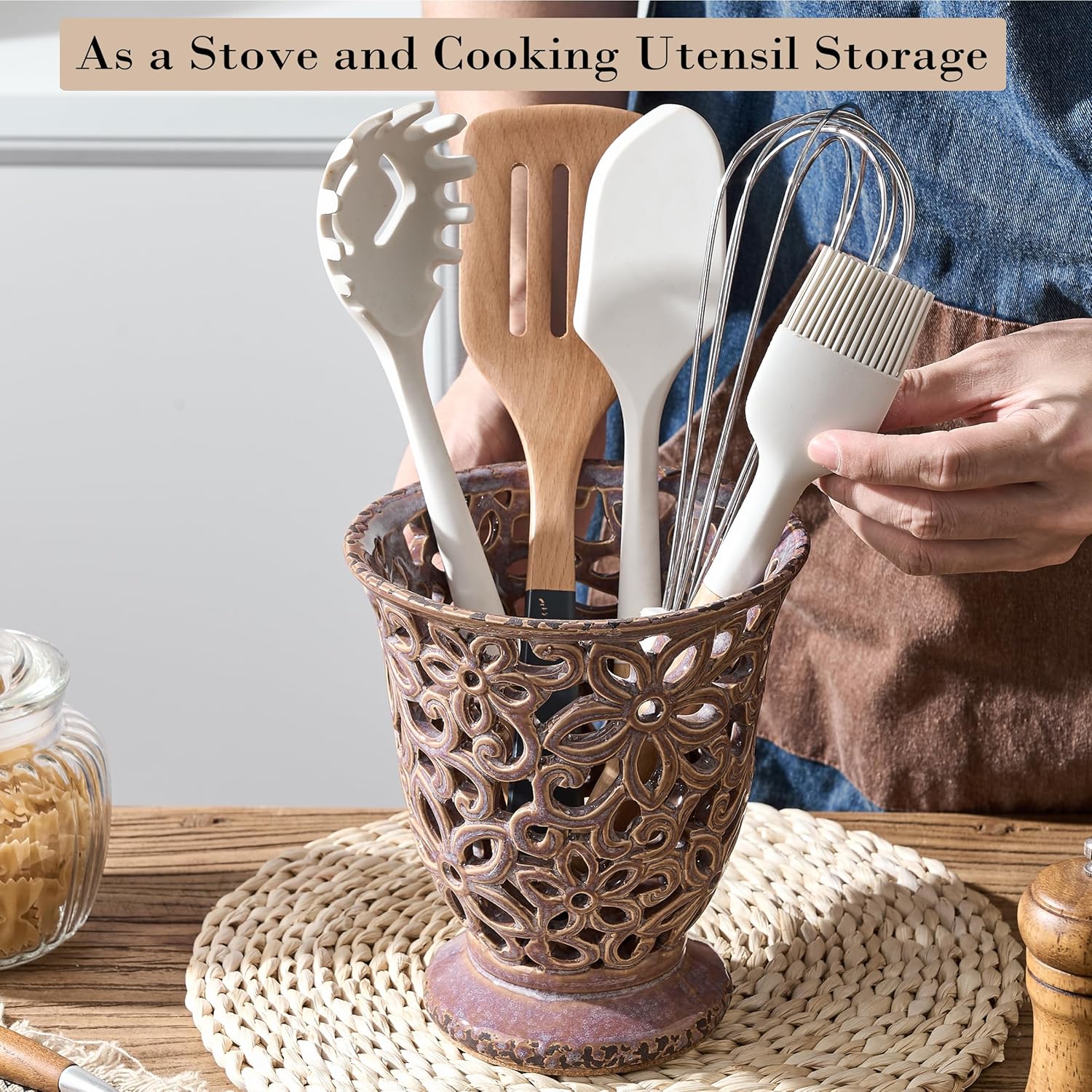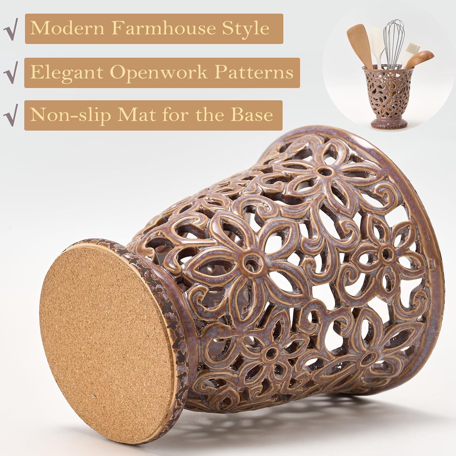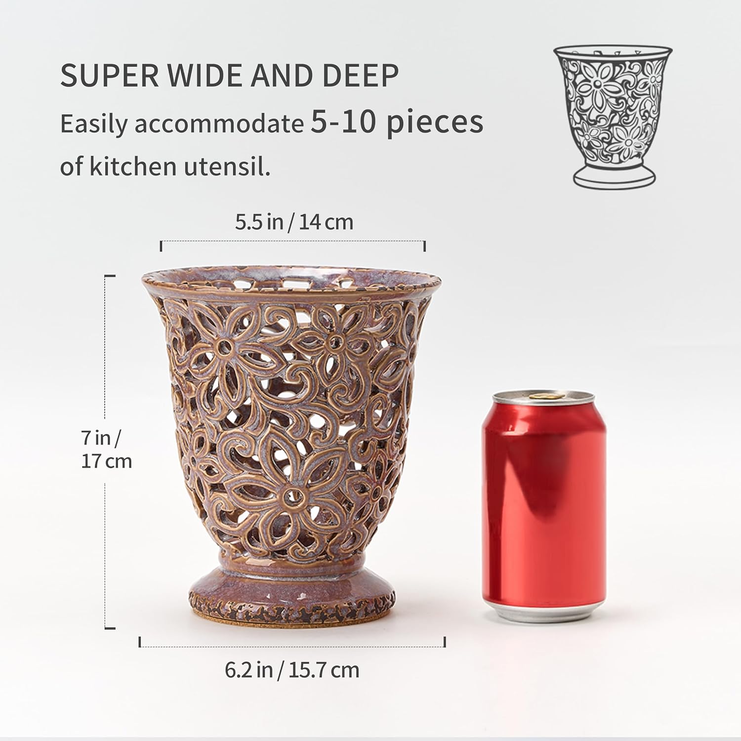 • [Durable Ceramic Craftsmanship]: Crafted from premium clay, this utensil crock features intricate carvings and professional openwork techniques. Handmade and kiln-fired with glaze, its delicate openwork patterns and vibrant, ever-changing glaze create a stunning visual effect.