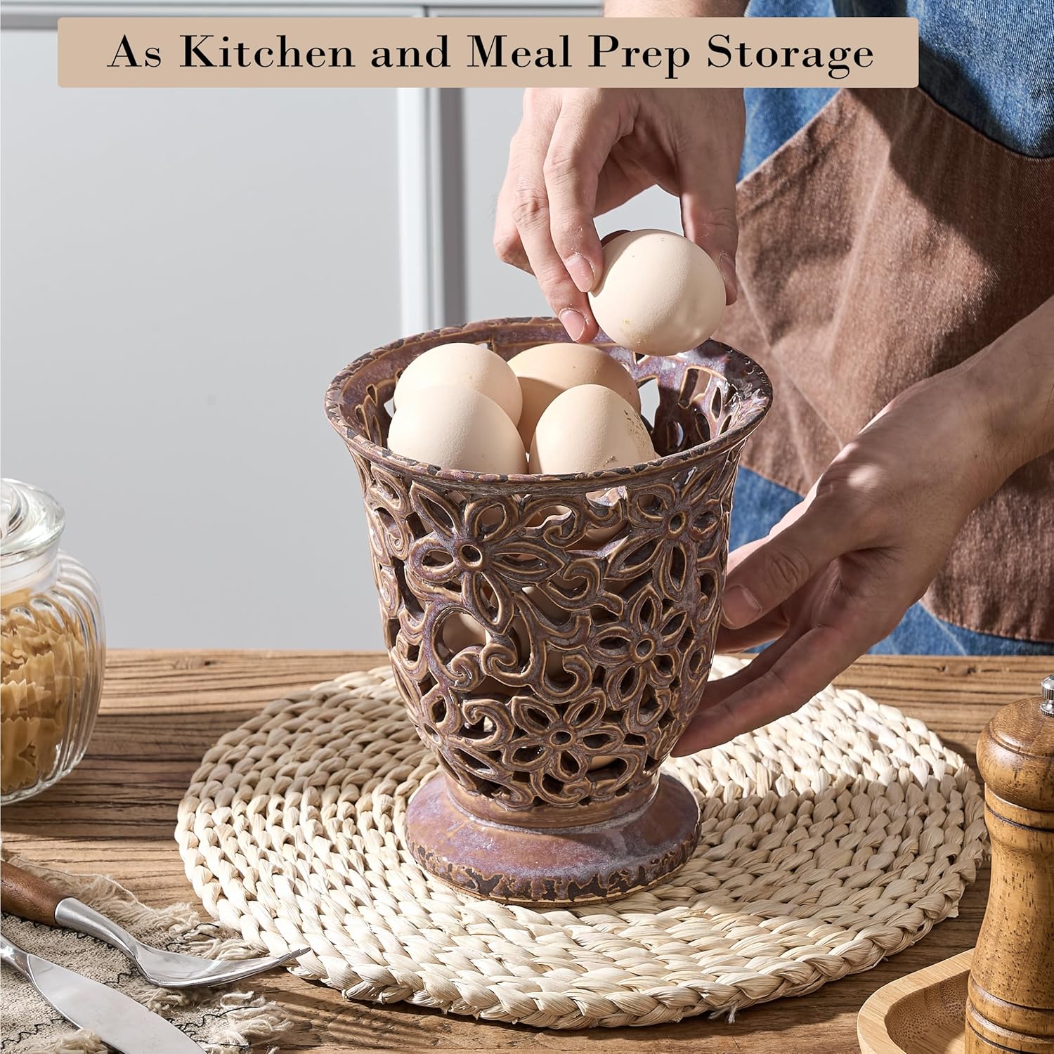 • [Versatile Ceramic Beauty]: This exquisite ceramic piece stores kitchen utensils, eggs or tomatoes/garlic on prep counters, coffee beans and milk sweets beside your coffee maker during afternoon tea, makeup tools on vanities, assorted small items in entryways, towels and toilet paper in bathrooms, or even serves as a vase for dried flowers as a home decor piece.