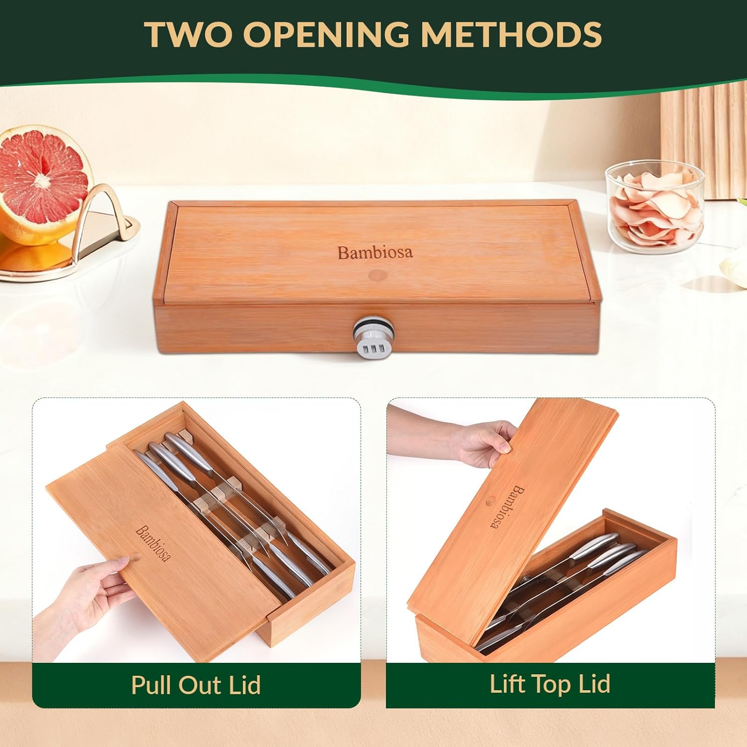• CHILD-SAFETY DESIGN: This knife drawer organizer features a stylish silver combination lock that effectively prevents children from accessing sharp knives, ensuring the highest safety standards. Includes instructions and video guidance for easy password setup. Offers two convenient access methods—slide-open and flip-top design—providing a flexible and secure storage solution for knives.