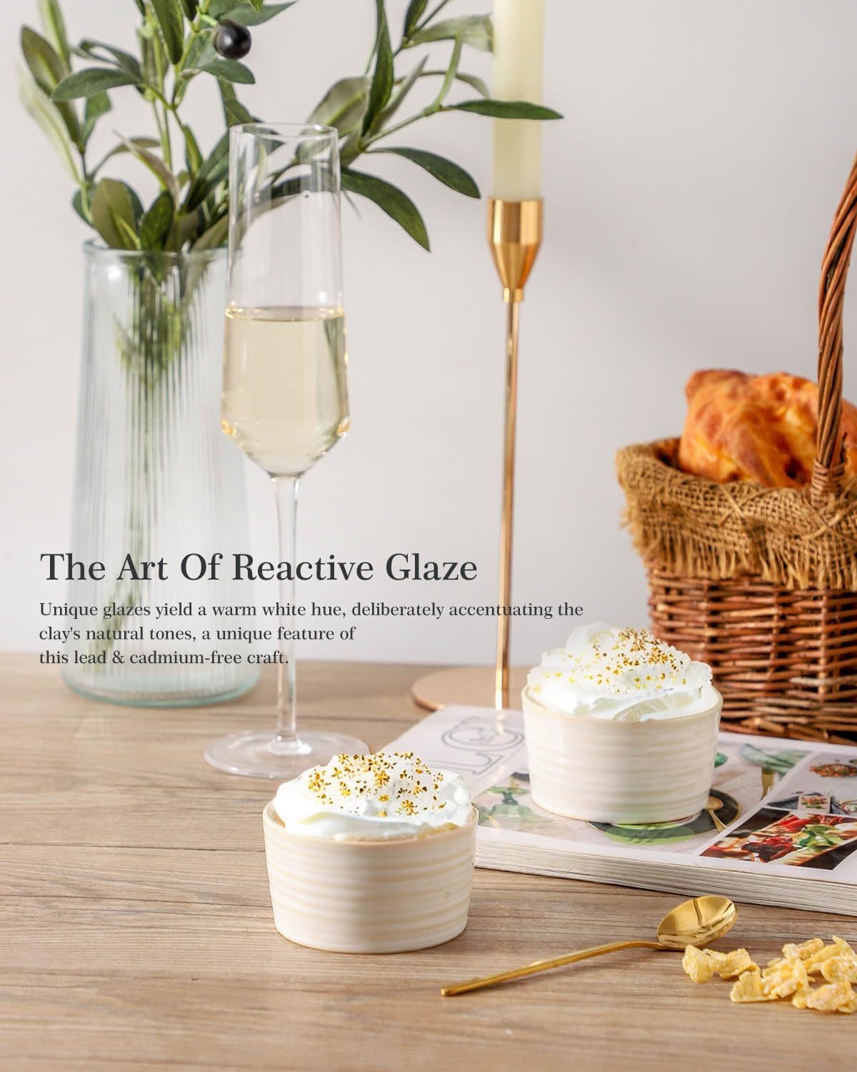 Hasense 4 oz Ramekins Oven Safe, Ceramic Creme Brulee Bowls Set of 6, Mini Baking Dishes for Souffle Pudding, Serving Dip, Custard, Ice Cream, Clay-Infused White