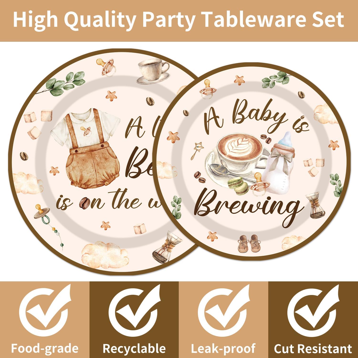 • High-Quality Materials: Our a baby is brewing baby shower decorations use thick paper plates, soft napkins, and sturdy forks. The tableware is printed with high-quality patterns for clear details and lasting color during your party