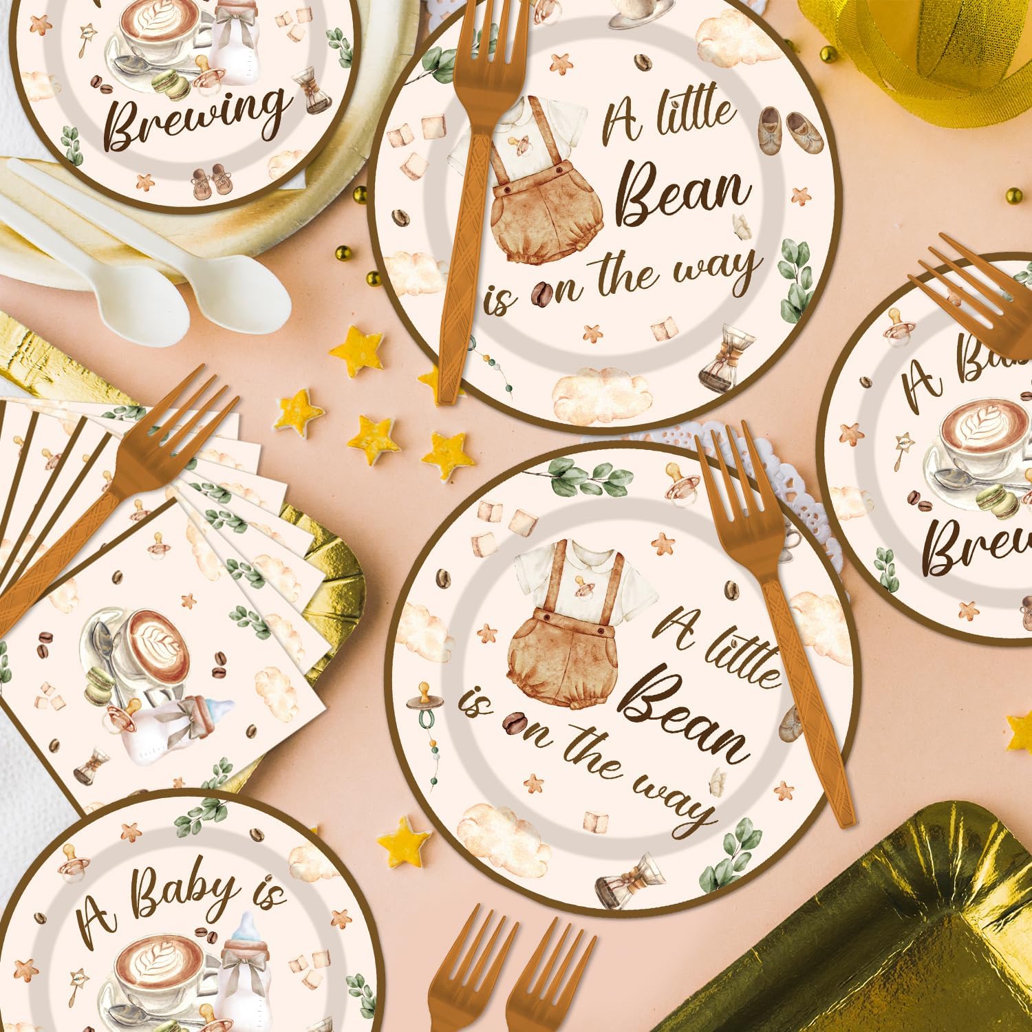 96Pcs Coffee Theme Baby Shower Tableware Set - A Baby Is Brewing Paper Plates Napkins Forks A litte Bean Is On The Way Gender Reveal Party Supplies Serve 24 Guests