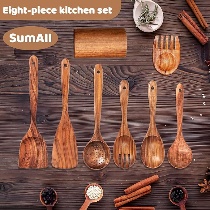 8 PCs Teak Wooden Utensil Set with Hooks, Wooden Spoons for Cooking, Wood Cooking Utensils Set, Comfort Grip, Non Stick Cookware, Easy to Clean, Kitchen Stuff, Wood Spatula