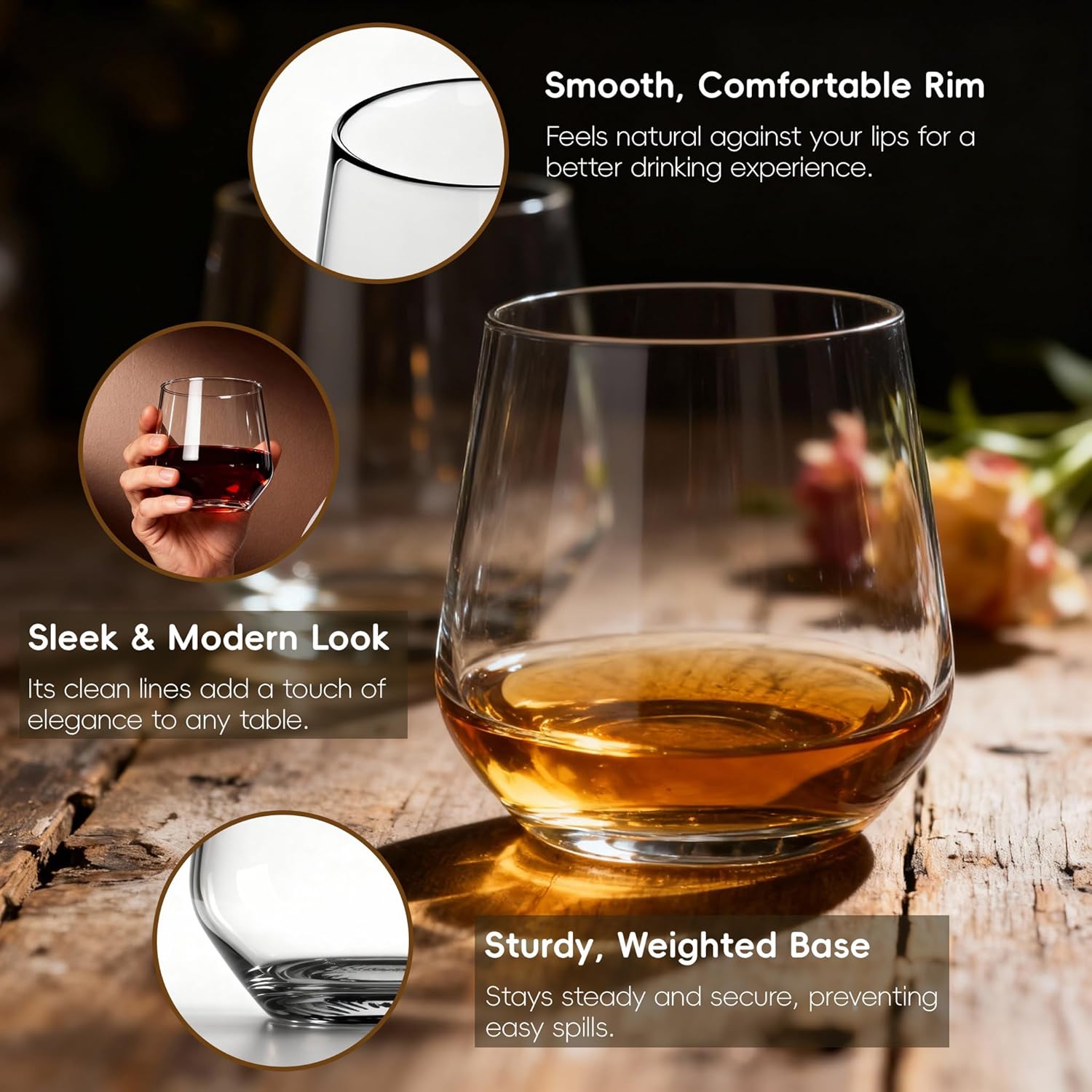 • 【Morden Design】The unique design of a 13.5oz stemless wine glass combines practicality and aesthetics. The base of the wine glass is firm, ensuring stability, glass cups can add elegance to your drink whether in daily use or in special occasions.