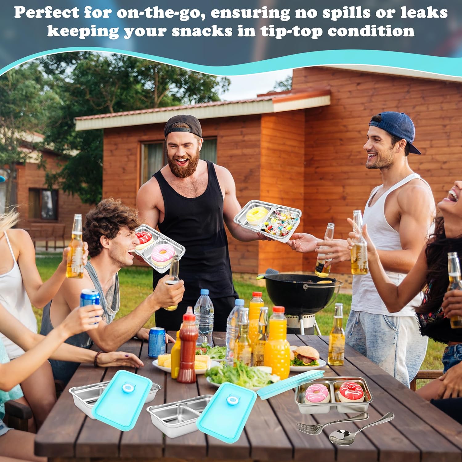 8 Set Stainless Steel Snack Containers with Lids Reusable 2 Compartment Snack Box Spoon Fork for Travel Outing Picnic Fruit Cookies Snacks Waffles Food