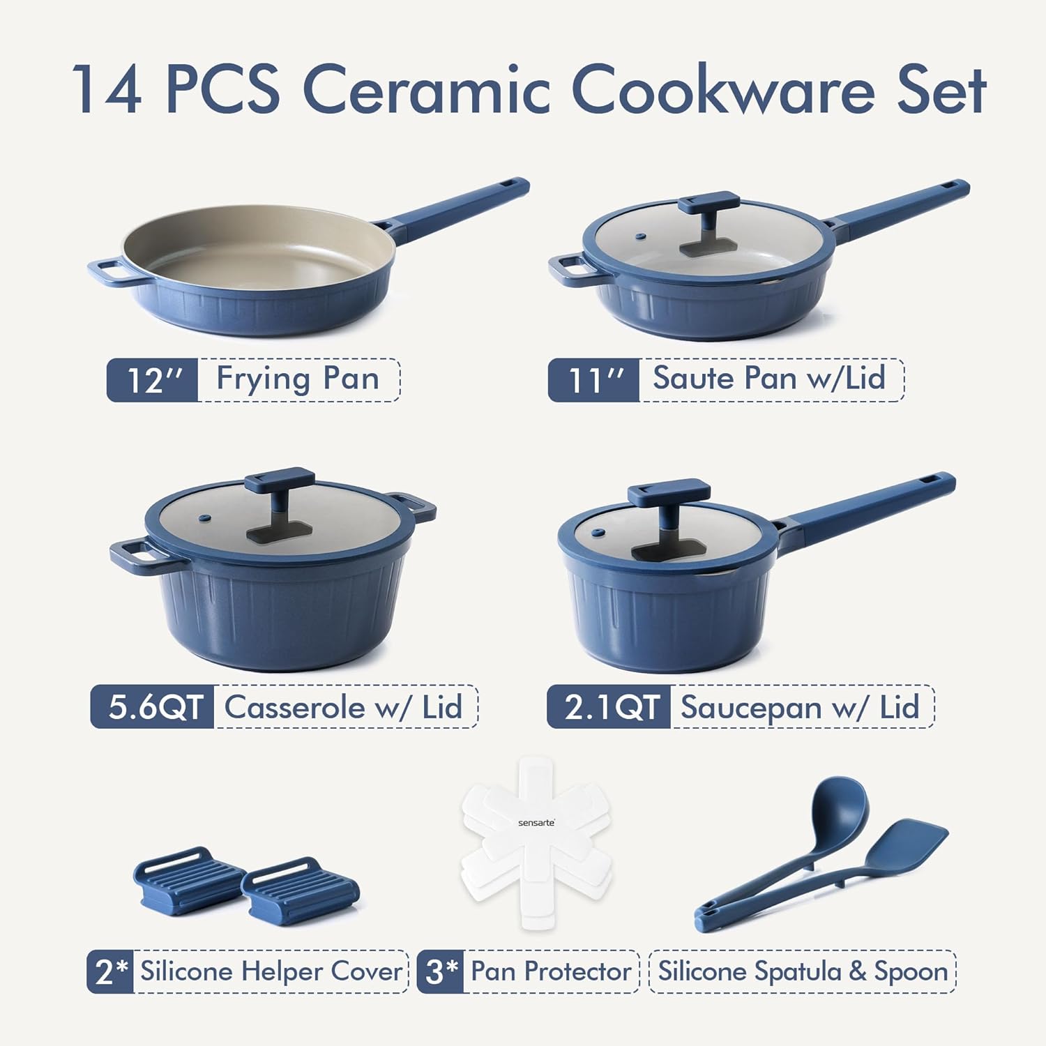 SENSARTE Ceramic Cookware Set Non-toxic 14 Pcs, Nonstick Pots and Pans Set, Dishwasher Safe Induction Cookware, Healthy Kitchen Cooking Set, PFOA/PFAS/PTFE Free