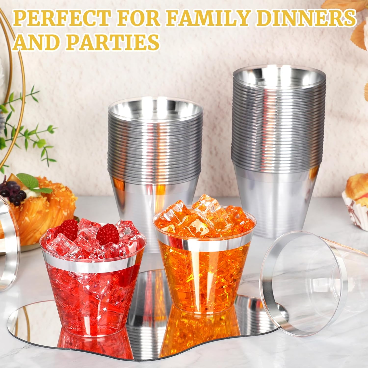 • Great Value Pack--Includes 100 Pack 9oz Silver Rimmed Plastic Cups,You Will Prepare Adequately For All Guests.These Silver Rimmed Plastic Cups Are Perfect For Any Special Occasion Such As Party,Wedding,Christmas,And Will Make Your Drinks Sparkle.