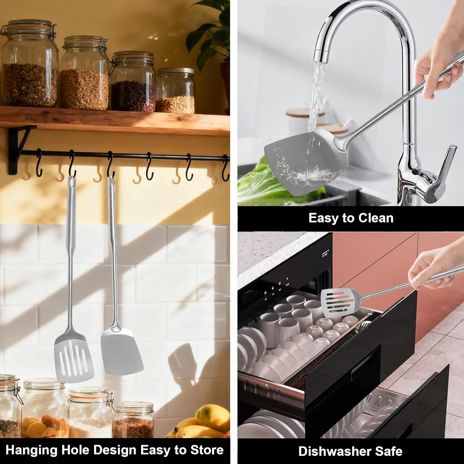 • 【Easy to Clean】These kitchen spatulas are easy to clean due to their smooth surface and high-quality stainless steel. Simply rinse with warm water and soap, or place them in the dishwasher. The handles feature a built-in hanging hole for convenient storage.