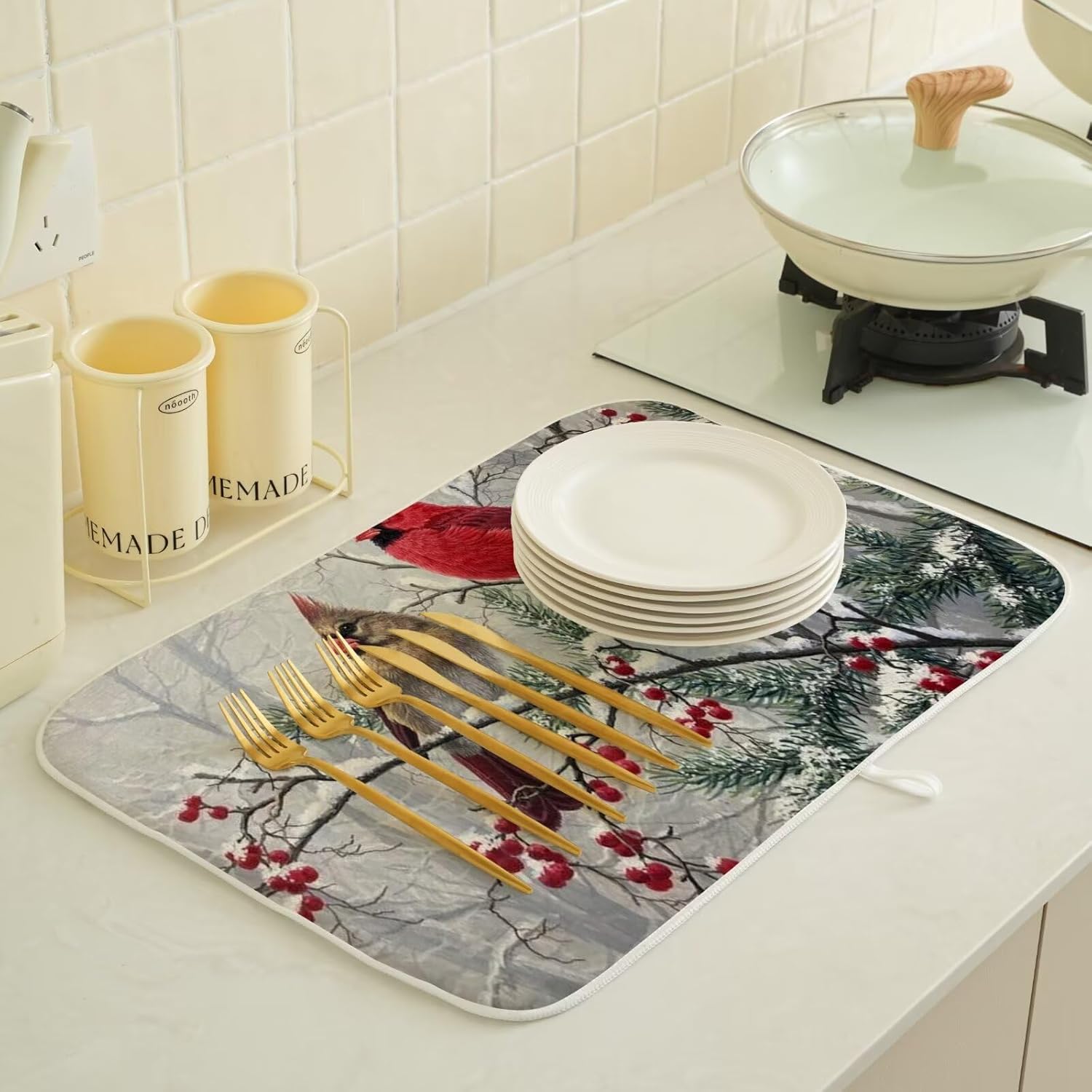 Winter Cardinal Bird Dish Drying Mat 18 x 24 inch Winter Snow Red Birds Pine Trees Decorative Drying Mats Microfiber Absorbent Holiday Dish Washable Draining Mat for Kitchen Counter Decor