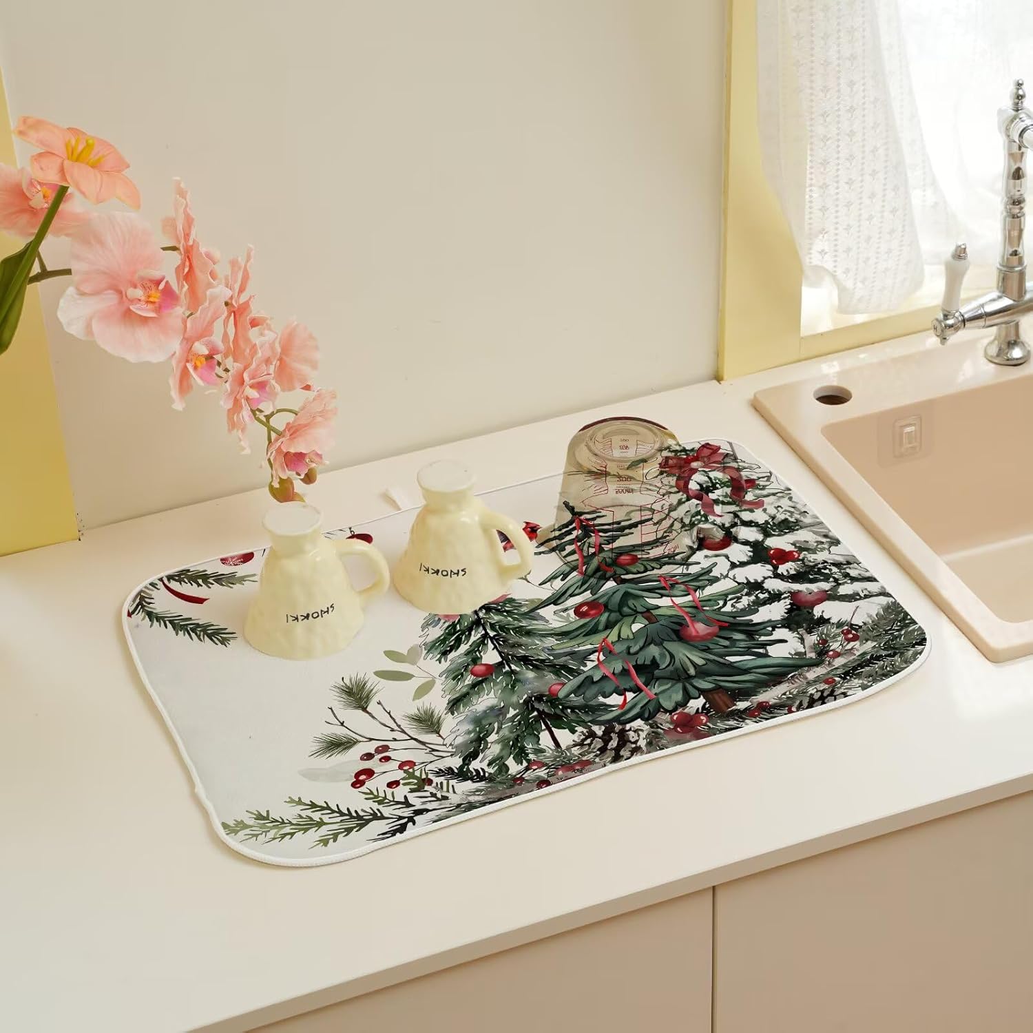• Absorbent: Winter christmas tree decorative dish drying mats for kitchen counter surface is a super absorbent microfiber and the middle is a composite sponge that can absorb water
