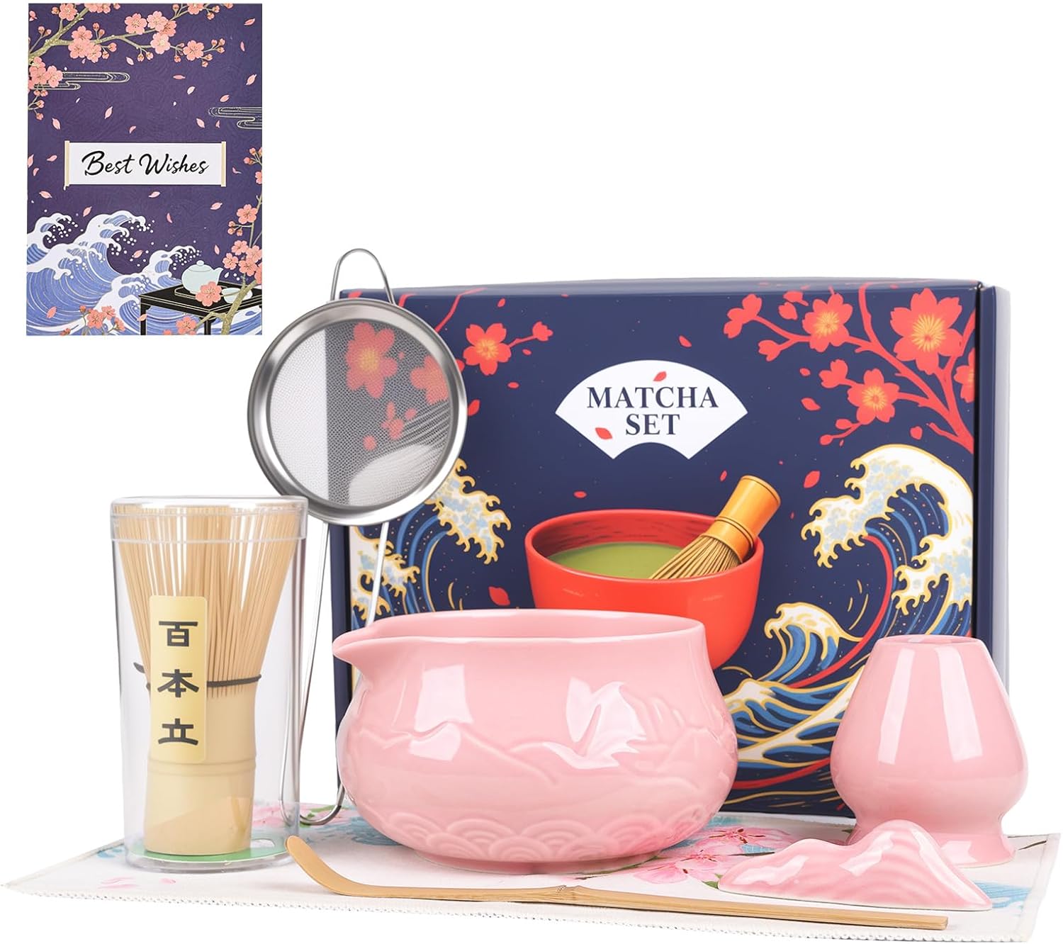 Evoio Matcha Whisk Set with Bowl, 8 Pcs Matcha Kit with Ceramic Matcha Whisk Holder, Scoop Holder, Sifter, Tea Towel, Greeting Card, Bamboo Whisk and Scoop, Pink Matcha Gift for Matcha Tea Lovers