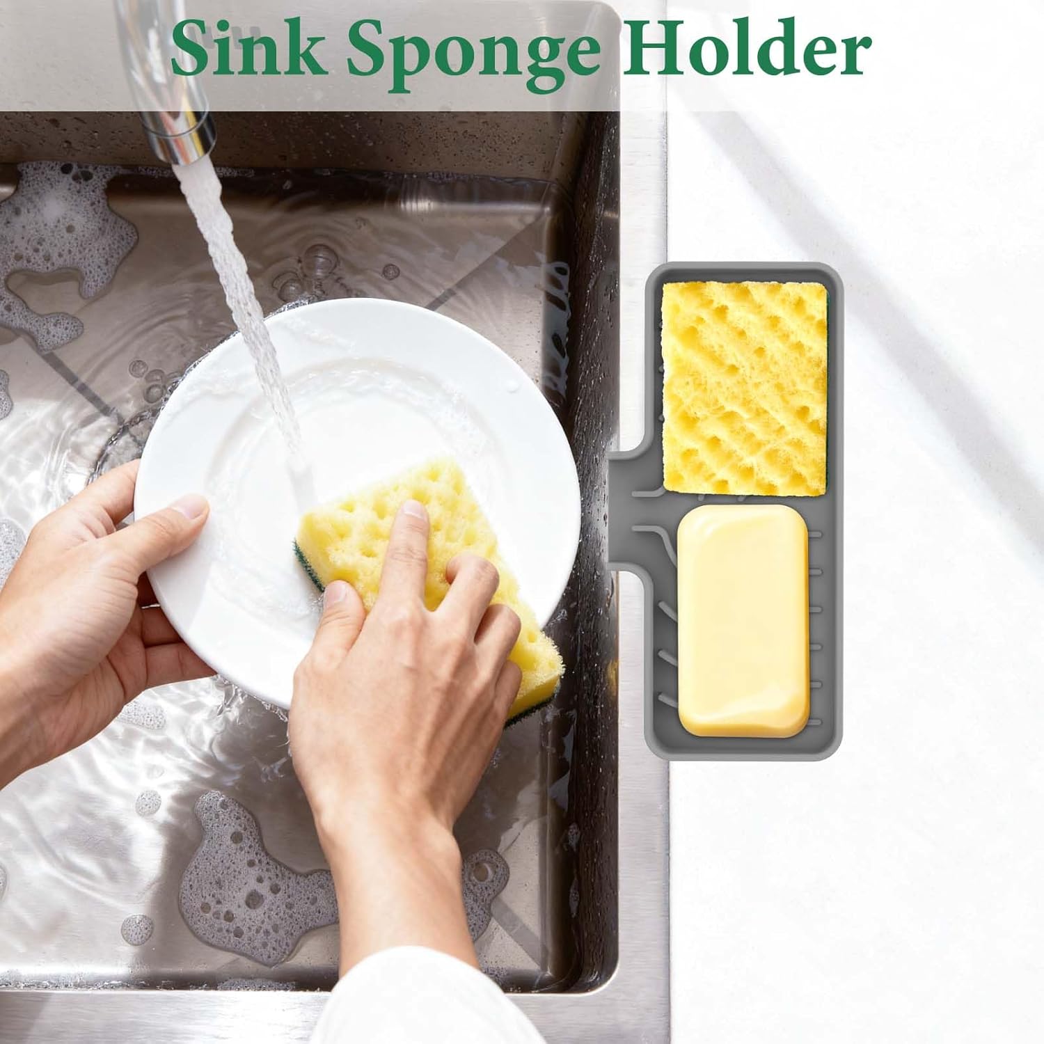 GUUKIN Sponge Holder for Kitchen Sink, 9.8"×4.9" Silicone Sponge Holder, Soap Tray with Drain, Dish Soap Mat for Shower Bathroom, Perfect for Dispenser,Scrubber,Bottle,Cup on Sink or Counter (Grey)