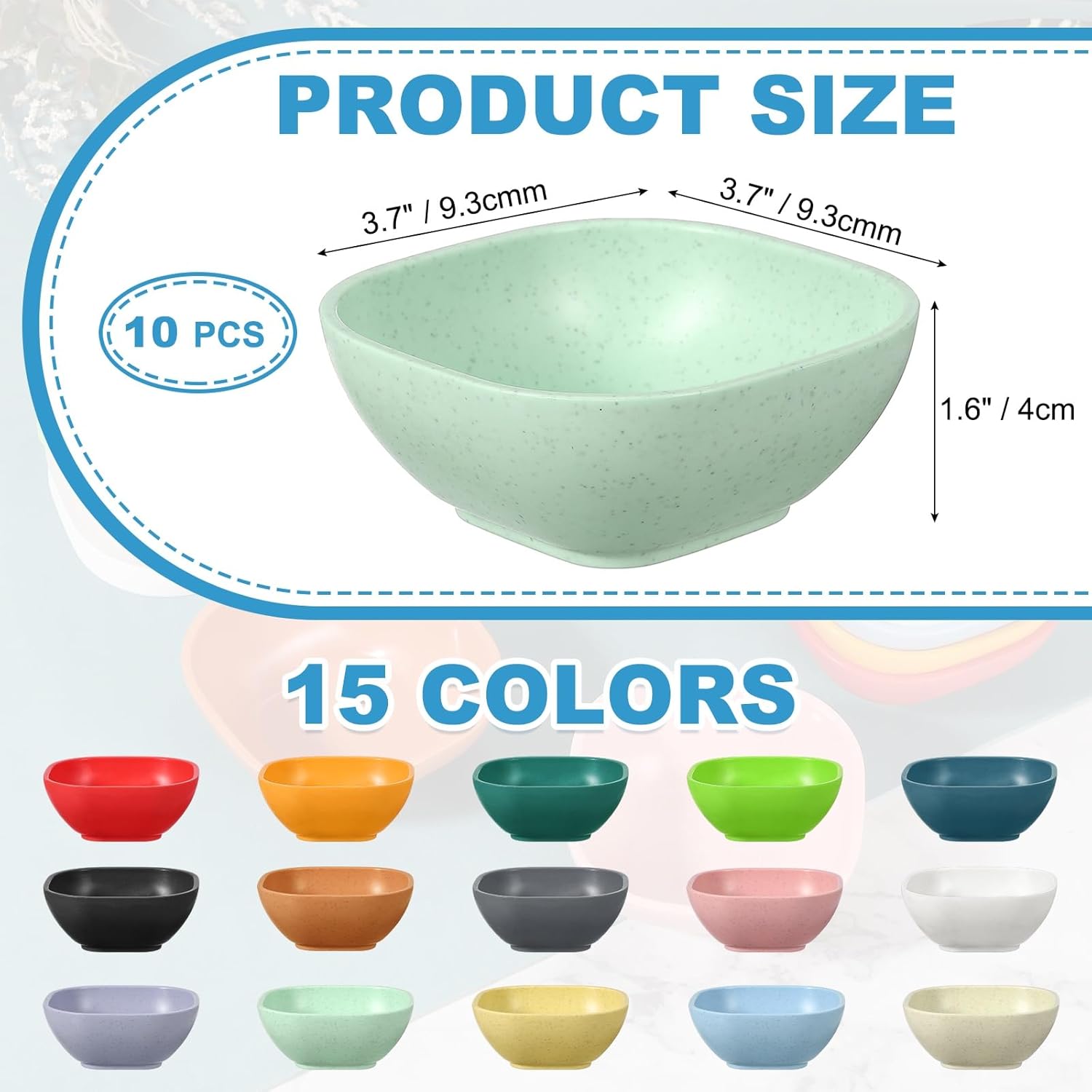 • Packing list: 10 Pcs x Small Dipping Bowls; Length: 9.3 cm/3.7 inch; Width: 9.3 cm/3.7 inch; Height: 4 cm/1.6 inch