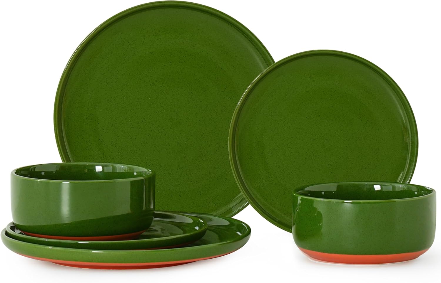 6 Piece Ceramic Dinnerware Set for 2, Modern Minimalist Stoneware Dinner Plates and Bowls, Microwave Safe, Dishwasher Safe, Versatile for All Seasons, Forest Glaze Green