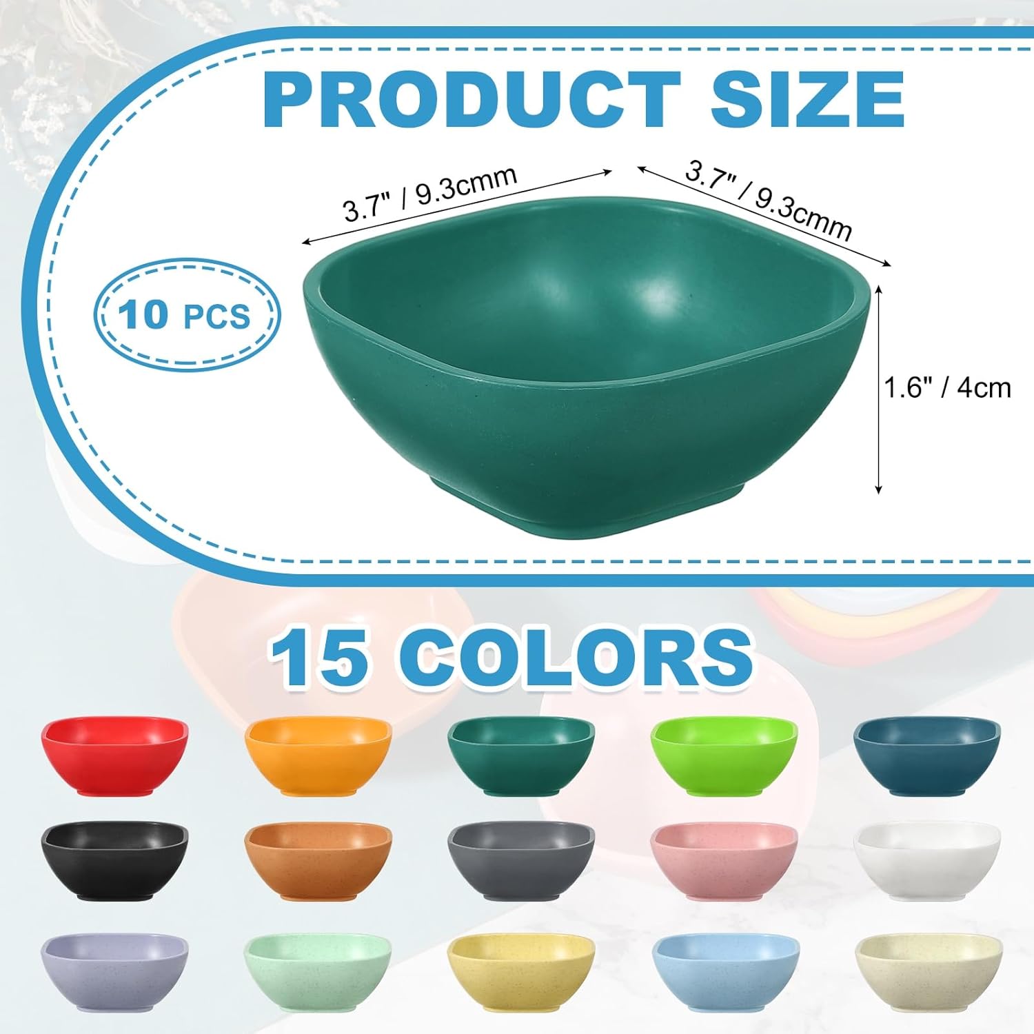 • Packing list: 10 Pcs x Small Dipping Bowls; Length: 9.3 cm/3.7 inch; Width: 9.3 cm/3.7 inch; Height: 4 cm/1.6 inch