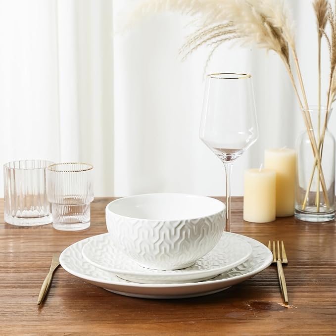 • Elegant Embossed Design: These dinnerware sets, designed by professional artists, feature four unique embossed patterns that bring refined elegance to your table; The textured surface increases friction, helping prevent slips—especially when handled with wet hands