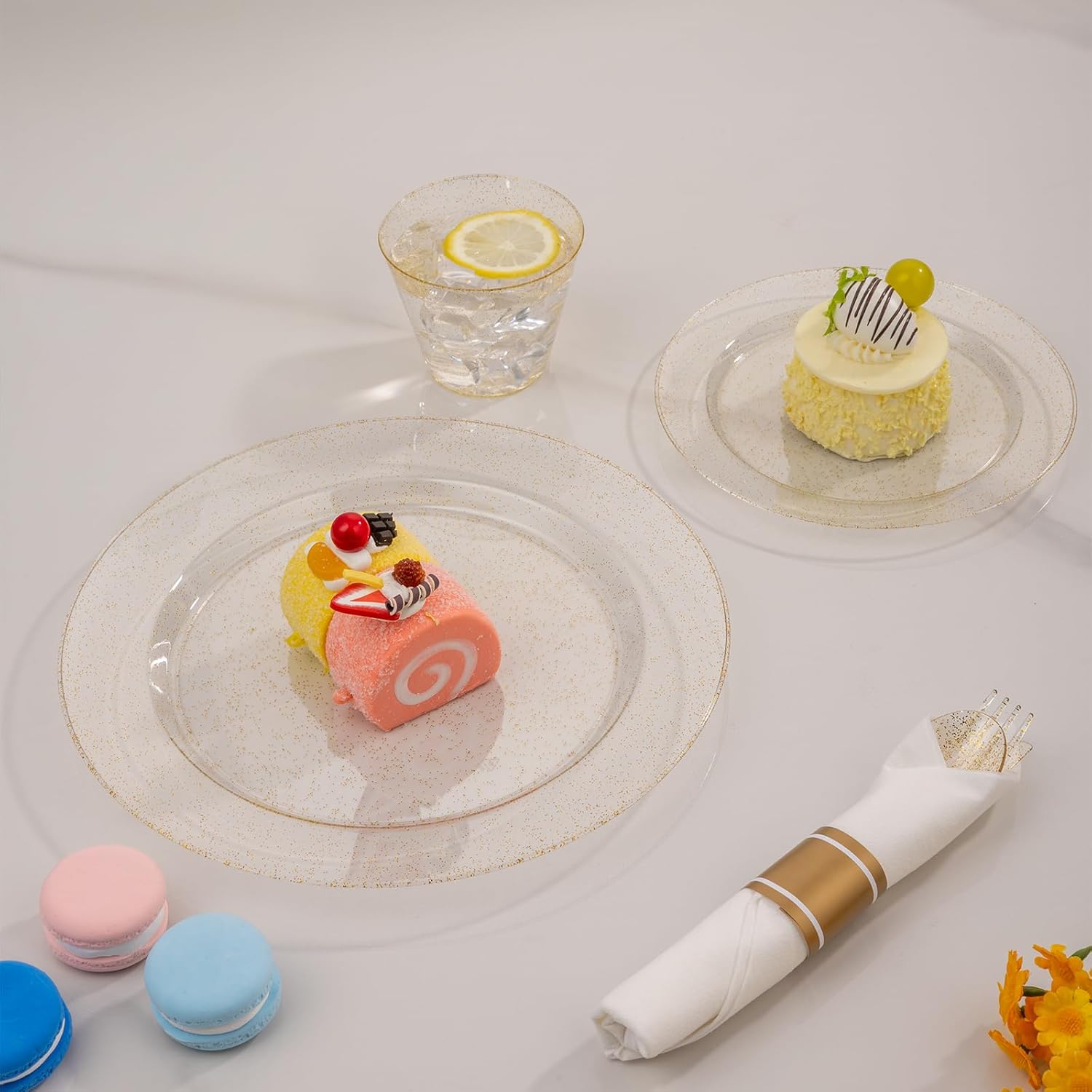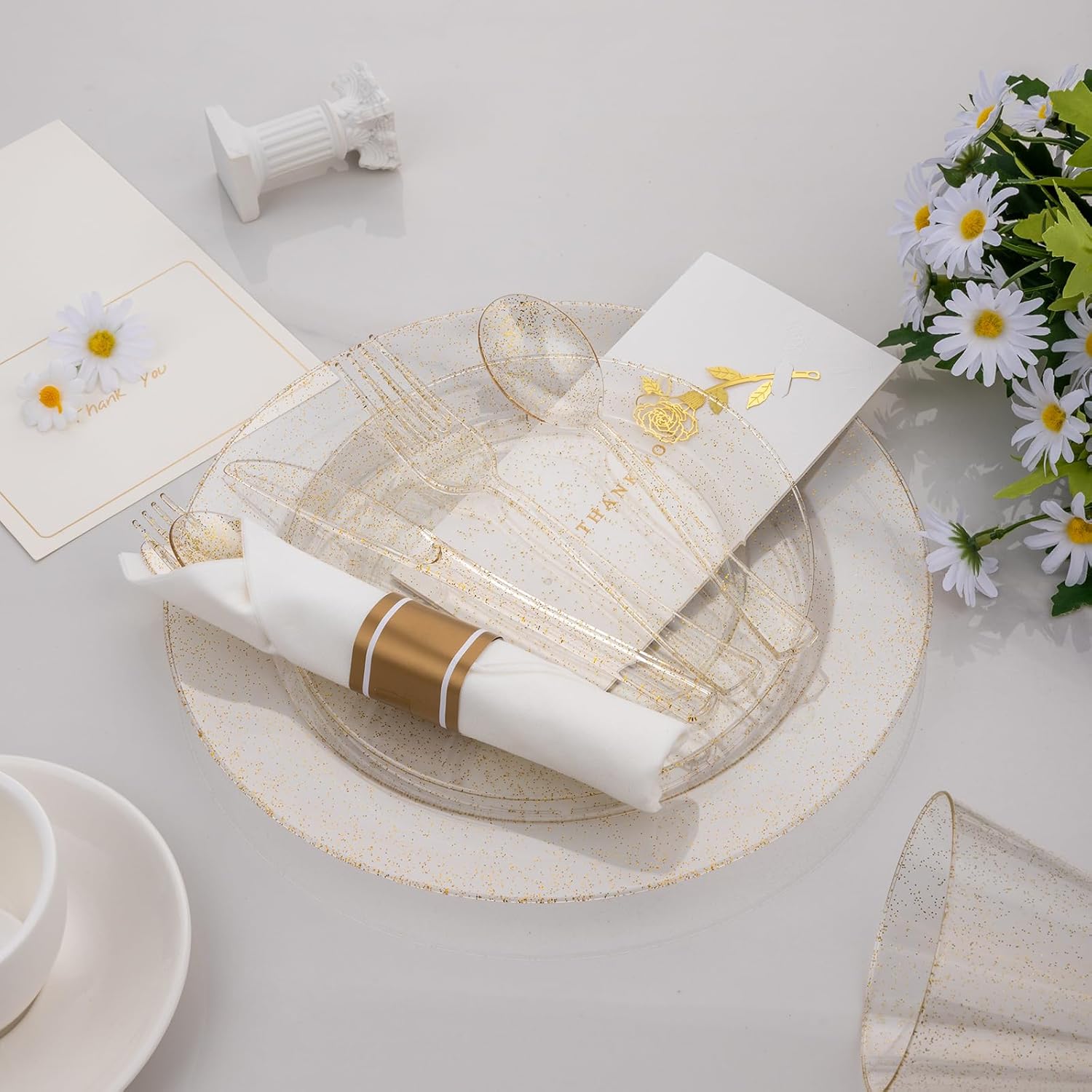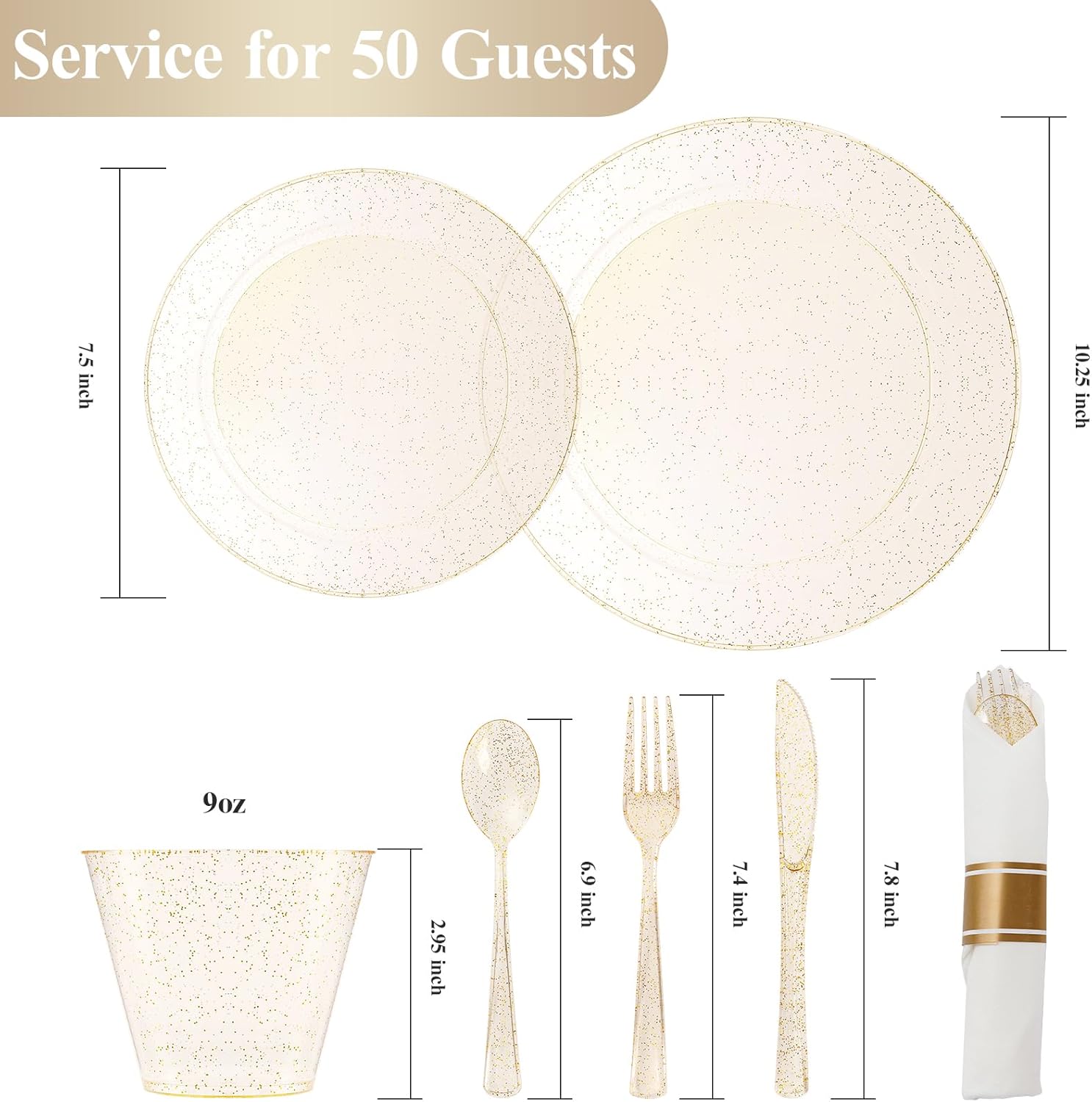 • All Occasions: The dinner plates and dessert plates are perfect for a range of events including weddings, birthdays, anniversaries and casual gatherings; the plastic gold silverware set is an ideal for various occasions