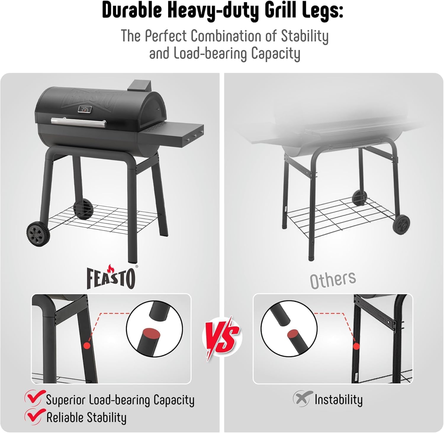 • Heavy-Duty & Movability BBQ Charcoal Grill: Designed with reinforced heavy-duty legs for superior stability and durability, also features two sturdy wheels for effortless mobility. Perfect for grand outdoor BBQ gatherings
