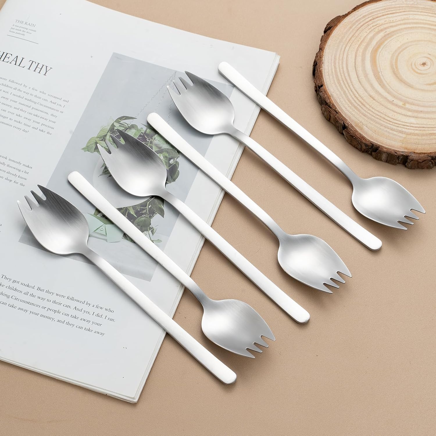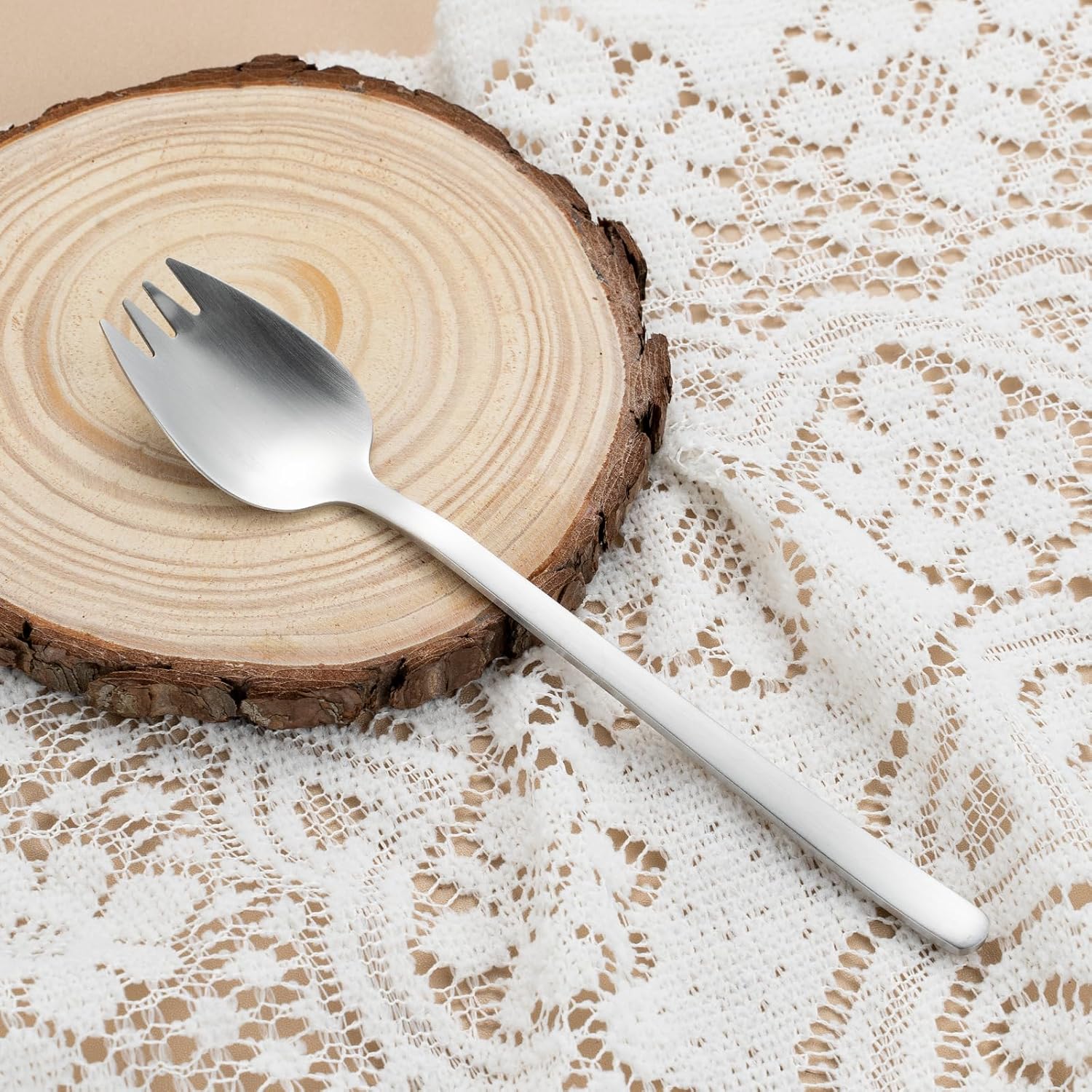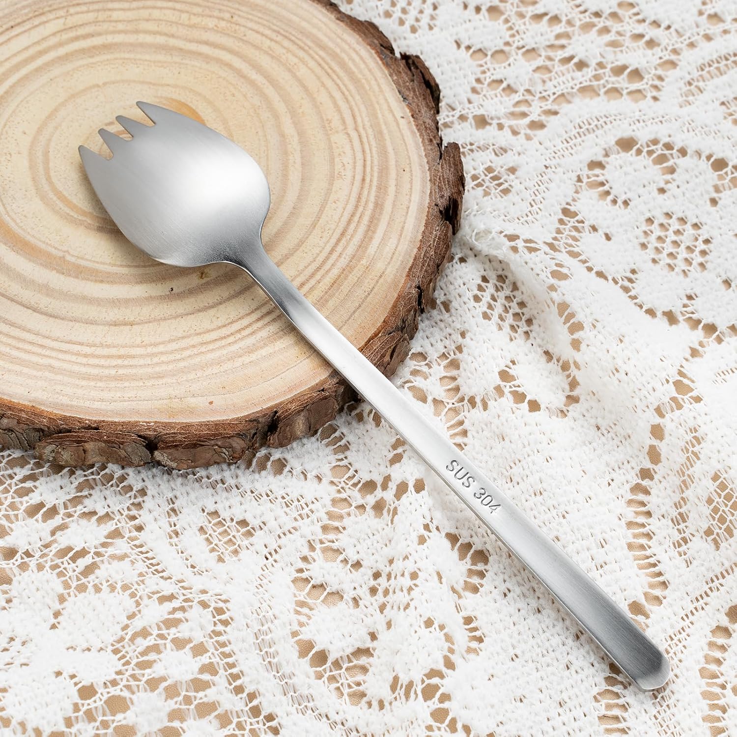 • ✨ Ergonomic Design for Comfort and Functionality The serving spoon and fork are designed with ergonomically rounded handles for a secure and comfortable grip. The spoon is ideal for serving liquids, while the fork securely holds salad leaves and pasta. The smaller forks feature a clever curved design, making them versatile for everything from ice cream and soup to noodles and fruit.
