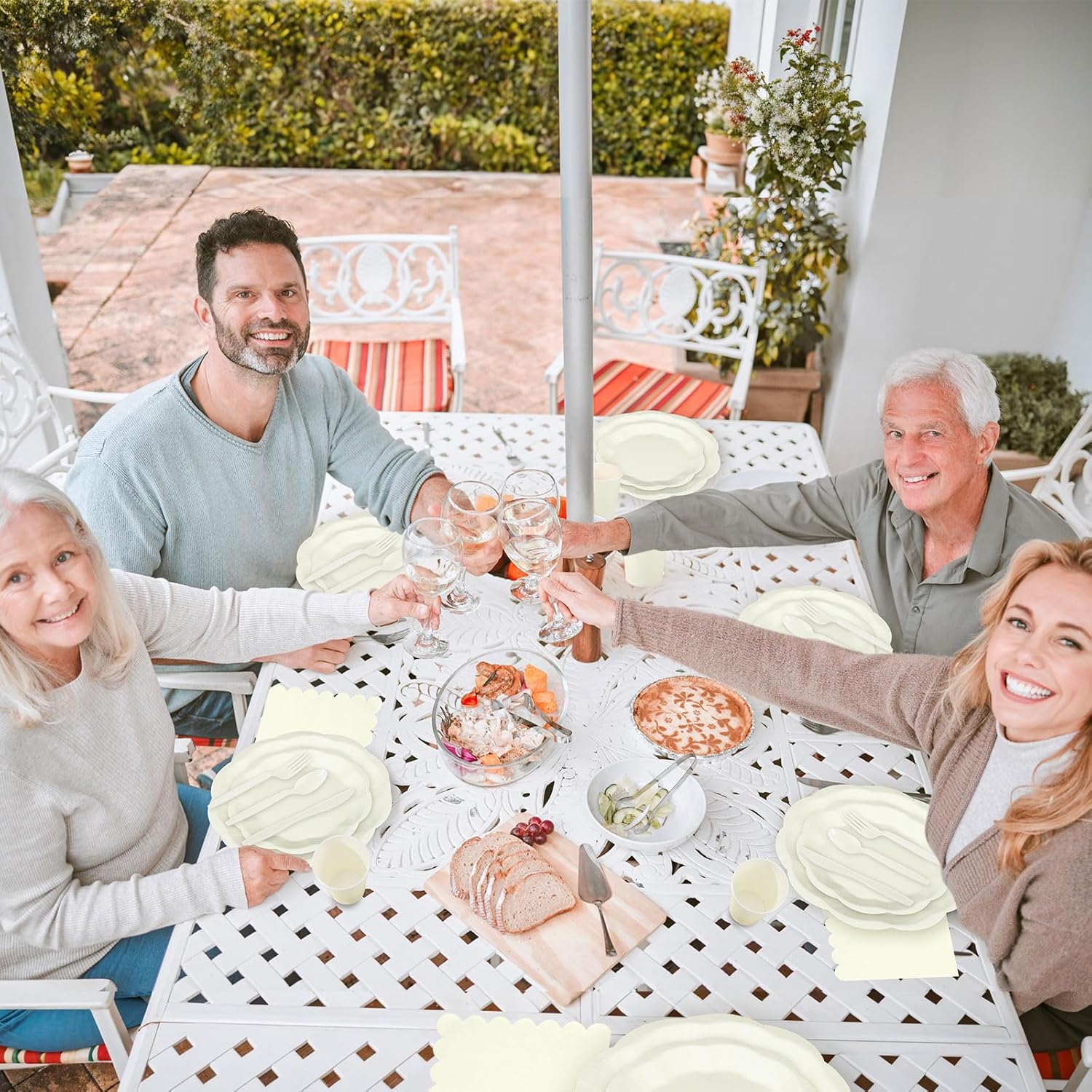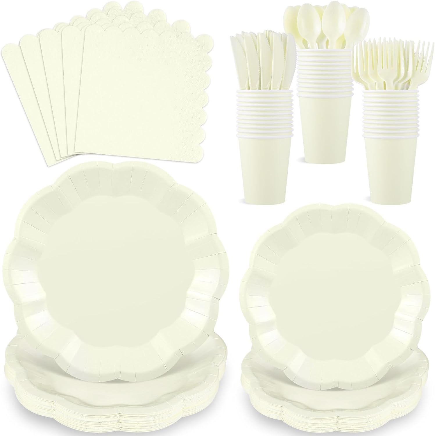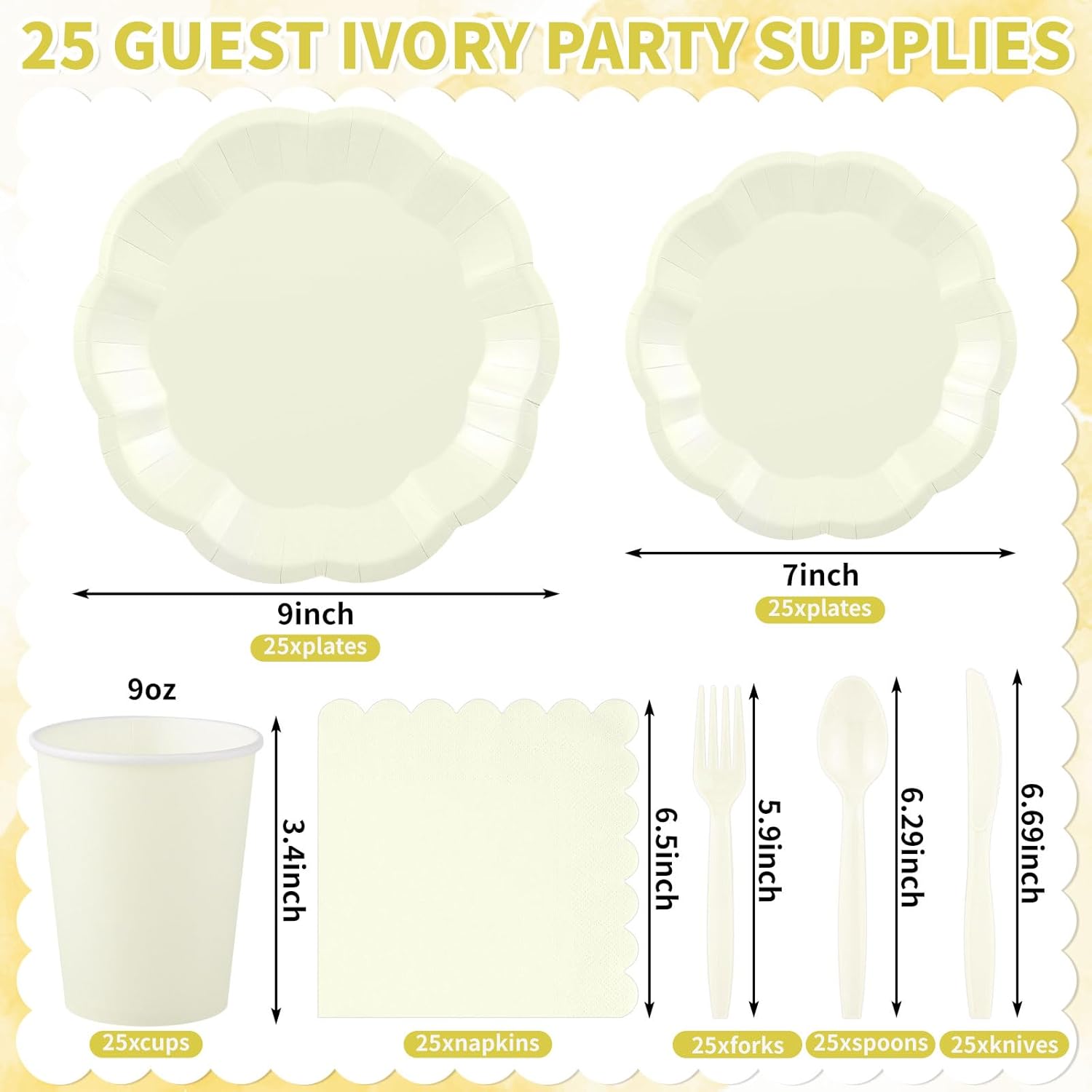 • 【Serves 25 Guests】You will receive 25 x 9 inch Ivory plates, 25 x 7 inch Ivory plates, 25 x paper cups, 25 x napkins, 25 x knives, 25 x forks, 25 x spoons, multiple quantity sets can meet your party needs and serve multiple guests
