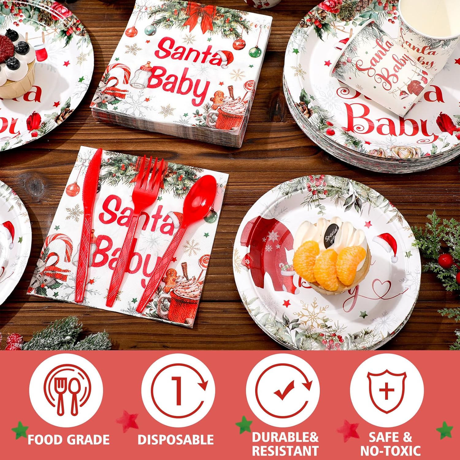 • Abundant Quantity for Baby Shower: there are 50 sets of Christmas baby shower decorations, including 50 pcs 9 inches paper plates, 50 pcs 7 inches paper plates, 50 paper napkins, 50 paper cups, 50 plastic knives, 50 plastic forks, and 50 plastic spoons; With so many pieces, you can accommodate the needs of your guests and ensure a memorable Christmas Santa baby shower experience