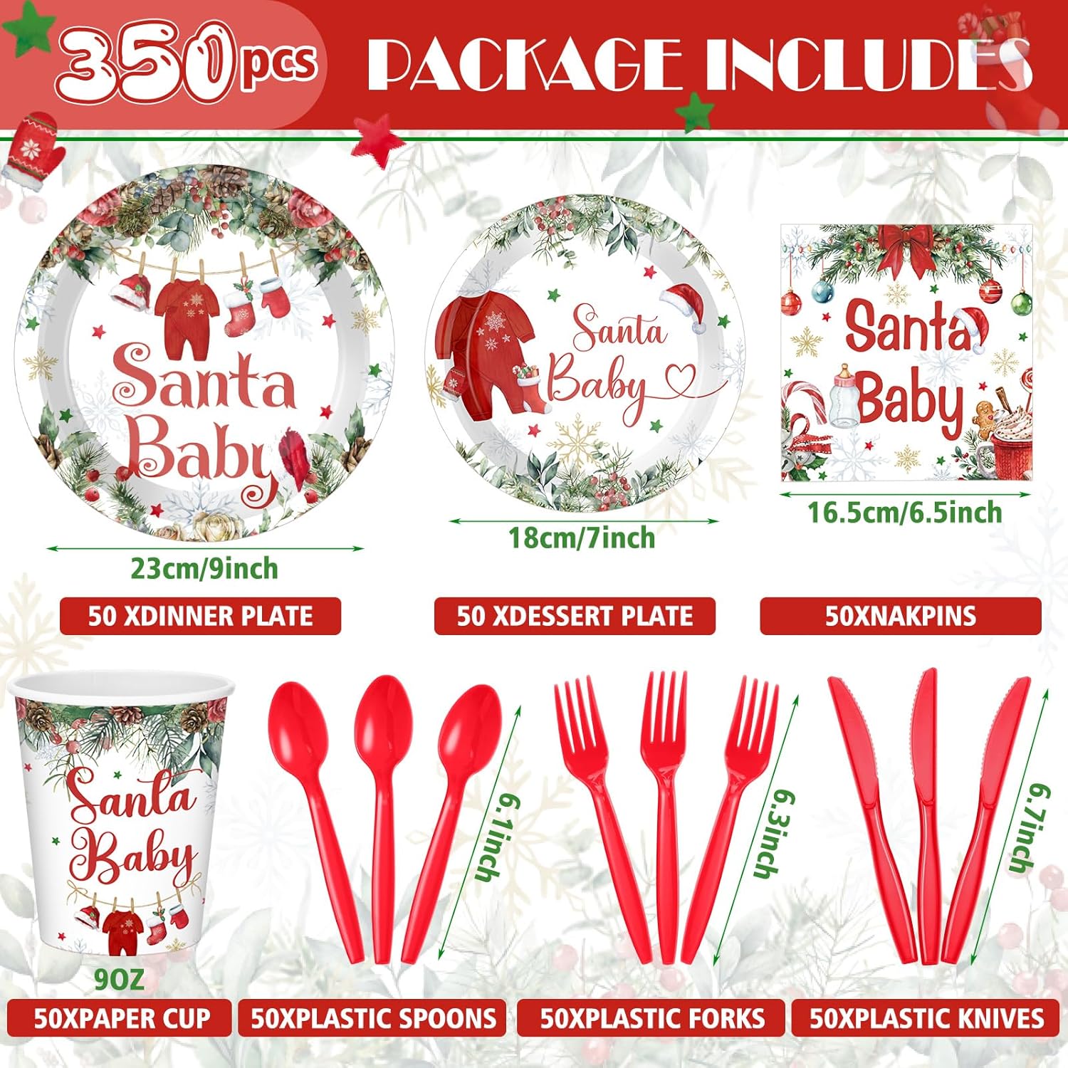 • Suitable Size: the Christmas Santa baby themed baby shower plates have 2 sizes, measuring about 9 inches/ 22.9 cm, and about 7 inches/ 17.8 cm, the paper napkin is about 6.5 inches/ 16.5 cm, paper cup is about 9 oz, plastic knives are about 6.7 inches, plastic fork is about 6.3 inches, and the plastic spoon is about 6.1 inches, suitable sizes, making them both practical and aesthetically pleasing
