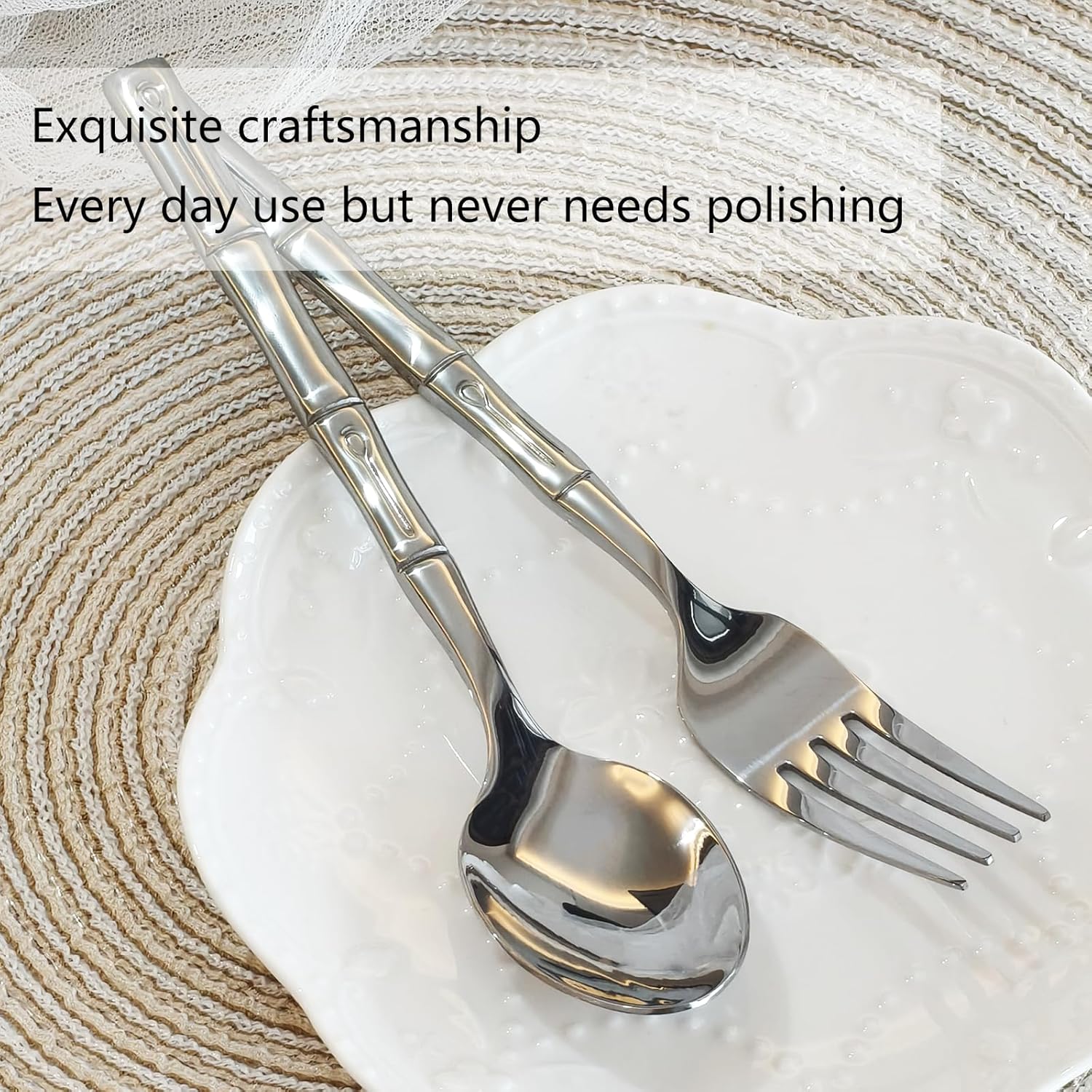 • 【ELEGANT AND COMFORTABL HANDLE DESIGN】:This silverware has a modern design with bamboo handle that provides a good grip for people of all ages. The cutlery is just the right weight and length.