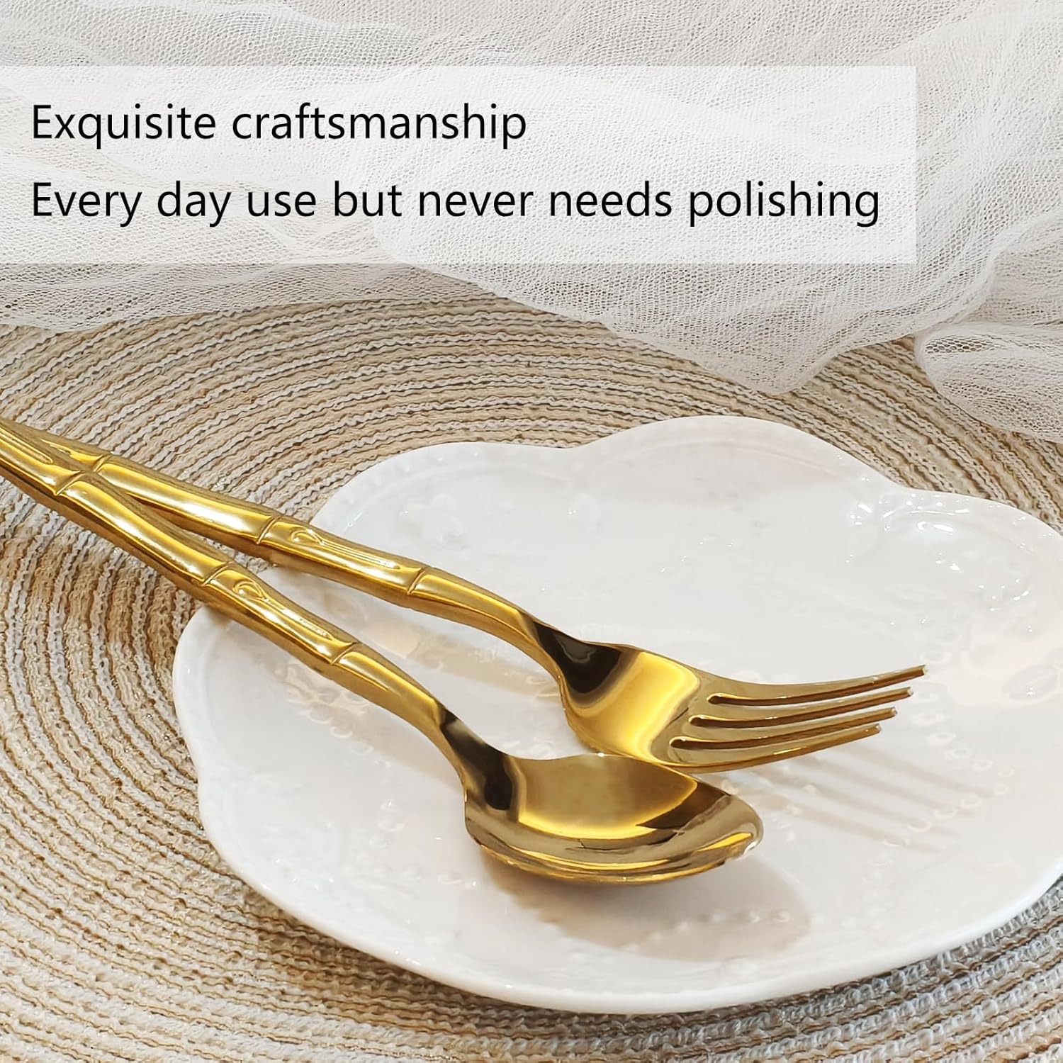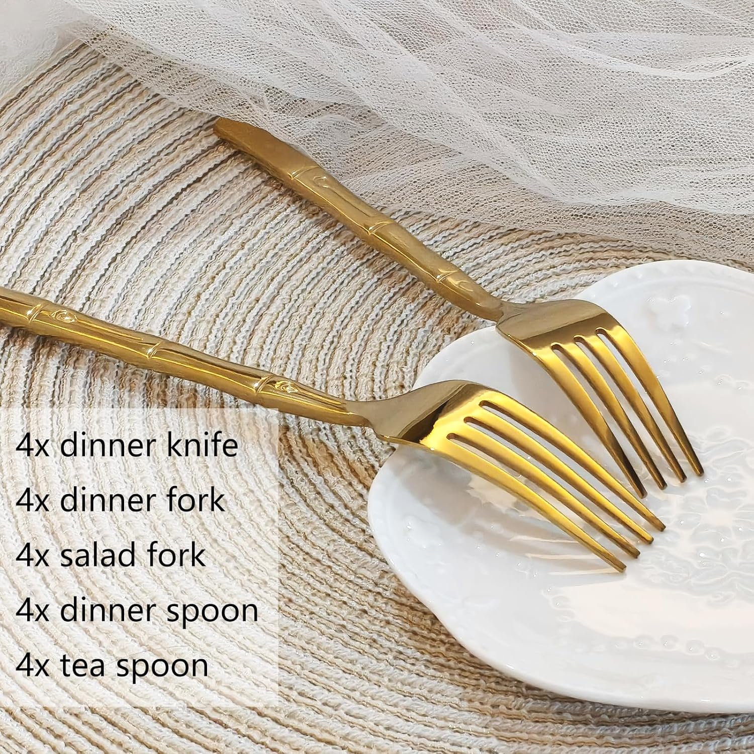 Gold 20-Piece Silverware Set, Bamboo Pattern Stainless Steel Flatware Set, Cutlery Set Mirror Polished, Dishwasher Safe, Service for 4