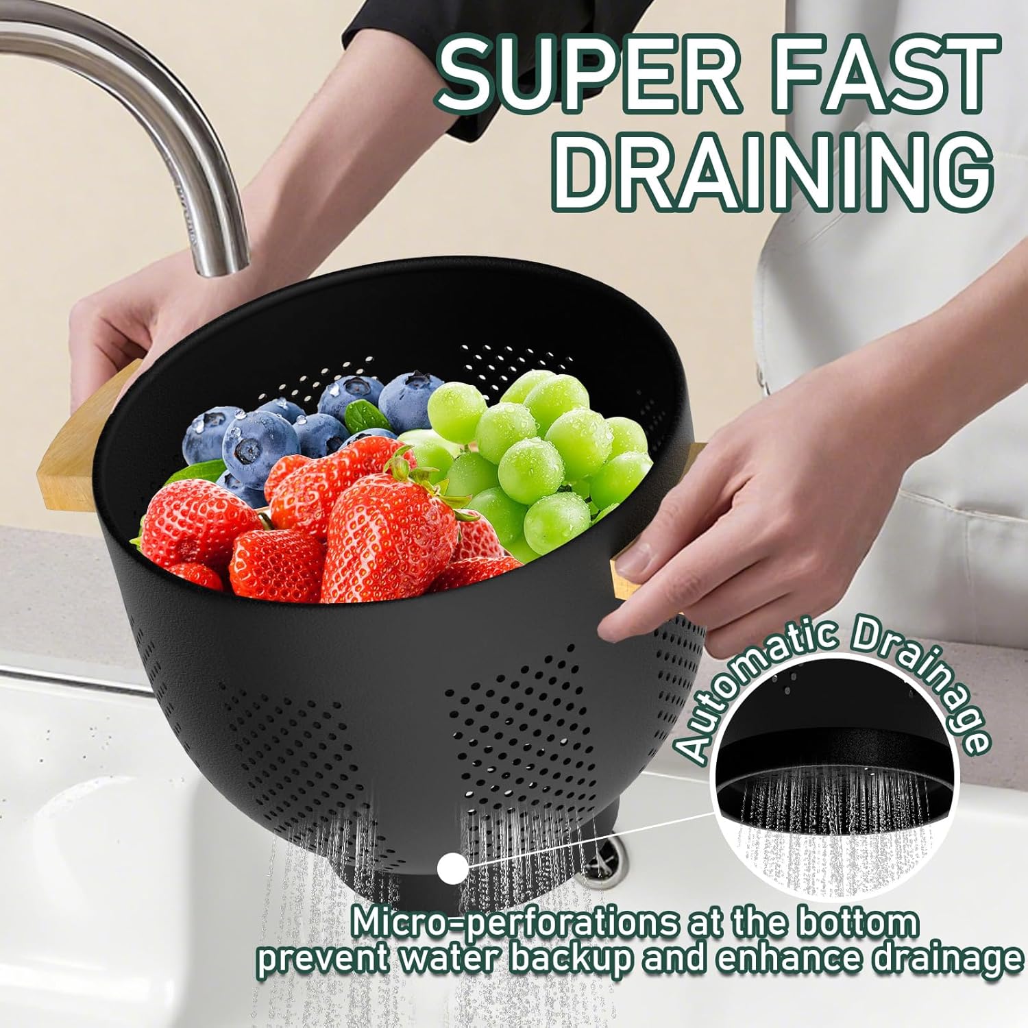 Metal Colander with Bamboo Wood Handle, 6 QT Large Strainer with Self-Draining Base, Kitchen Strainer Bowl for Pasta Spaghetti Vegetables Fruit Berry, Essential Kitchen Appliance and Gadget (Black)