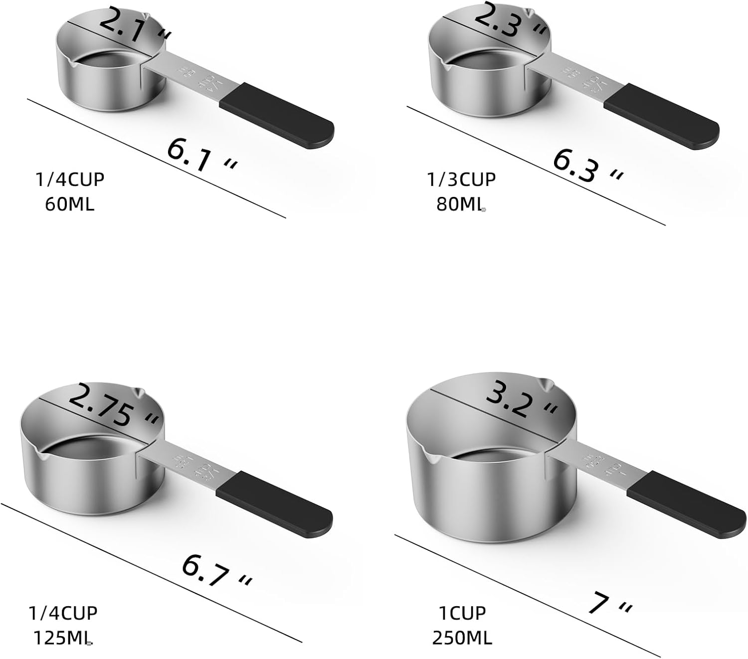 • πŸ”’ All-in-One Precision Set – Includes 1 Cup, 1/2 Cup, 1/3 Cup, 1/4 Cup, 1 Tbsp, 1 Tsp, 1/2 Tsp, and 1/4 Tsp – ideal for baking, cooking, sauces, or coffee β˜•. Accurate measuring for every recipe from home meals to gourmet desserts 🍰.