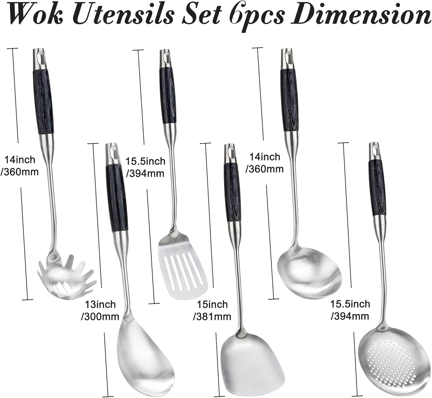 • 【Size of Wok Utensils Set】:14-15.5 inches length,enough length ensures that we keep our hands away from the hot wok while making delicious meals with ease. Doesn't react with foods and ensure them delicious
