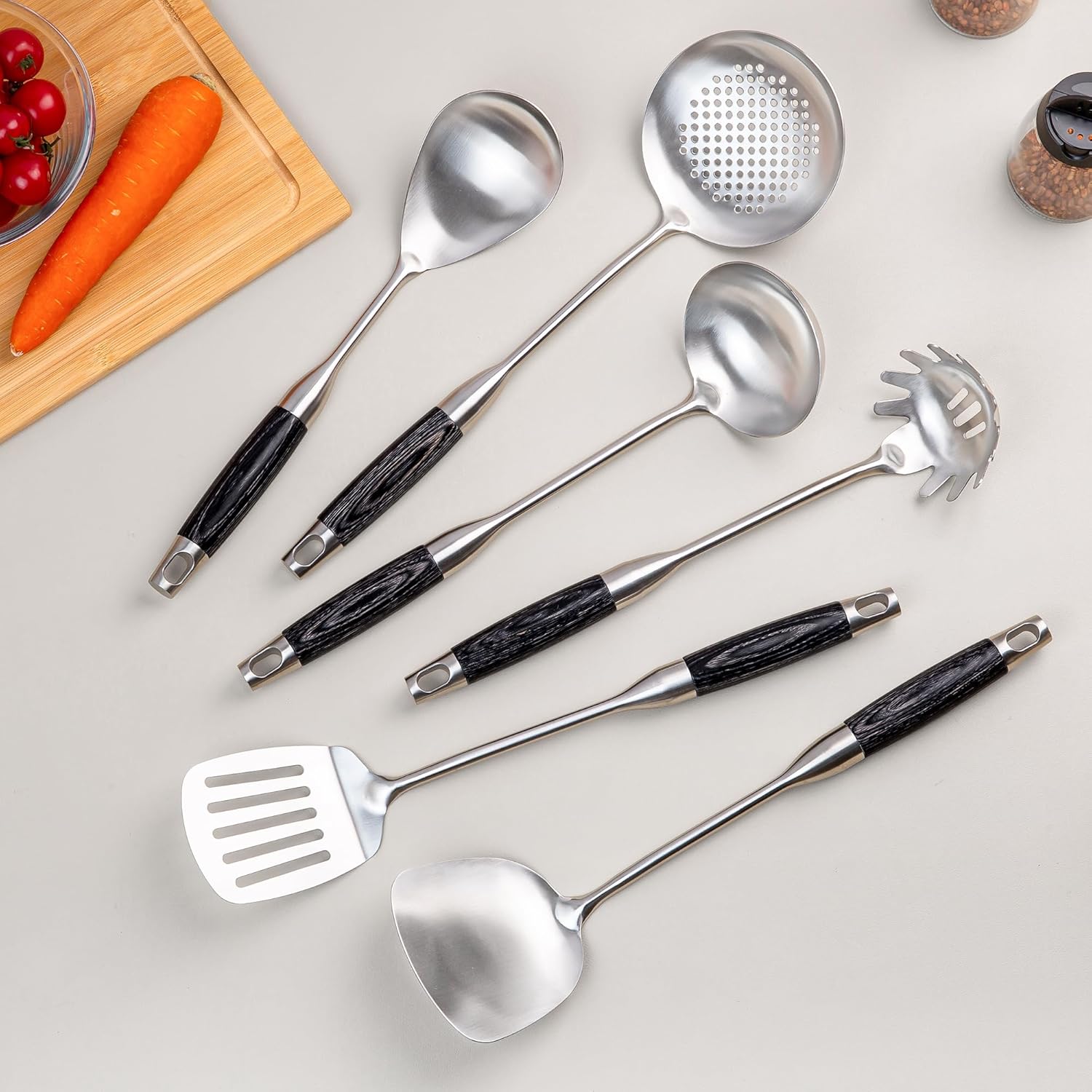 FJNATINH Stainless Steel Kitchen Utensils, Set of 6 Cooking Tools with Wooden Handle, Wok Spatula, Soup Ladle, Skimmer Spoon, Slotted Spatula Turner, Spaghetti Server, Solid Spoon