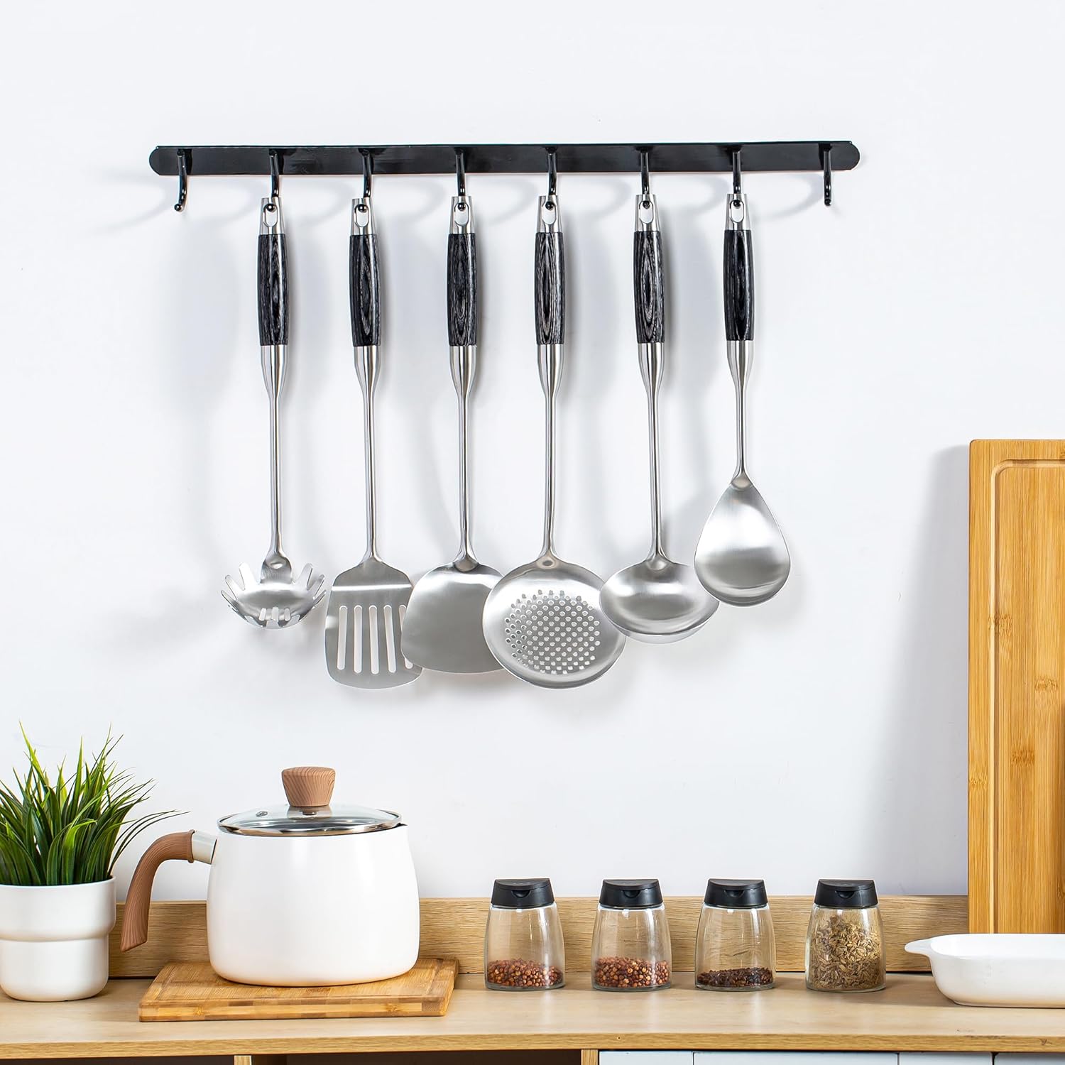 • 【Using high quality utensil set】:Stainless steel & wood handle, durable, easy to clean, not easy to have dents, cracks, rust or fall off. Excellent workmanship, smooth edges and lines.The punch design of the handle is also convenient for storage