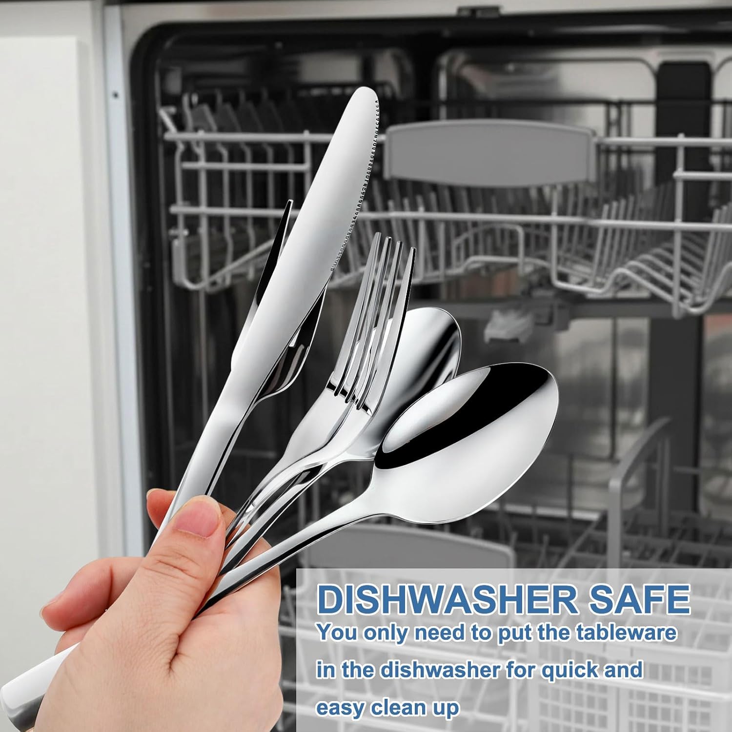 • 【DISHWASHER SAFE & EASY TO CLEAN】For everyday care, these silverware sets are dishwasher safe. To best preserve the pristine mirror finish long-term, we recommend a gentle hand wash with mild dish soap. Avoiding abrasive cleaners or scouring pads will keep the sleek surface looking as new as the day you bought it.