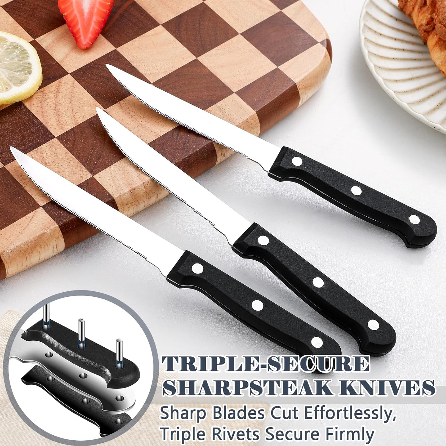 • 【RAZOR-SHARP SERRATED STEAK KNIVES】The silverware sets includes eight specially designed three-prong serrated steak knives. Their sharp, precision edges effortlessly slice through meat without tearing, ensuring a perfect cut every time. This feature makes them ideal not just for steaks but also for various other meats and tough-skinned fruits.