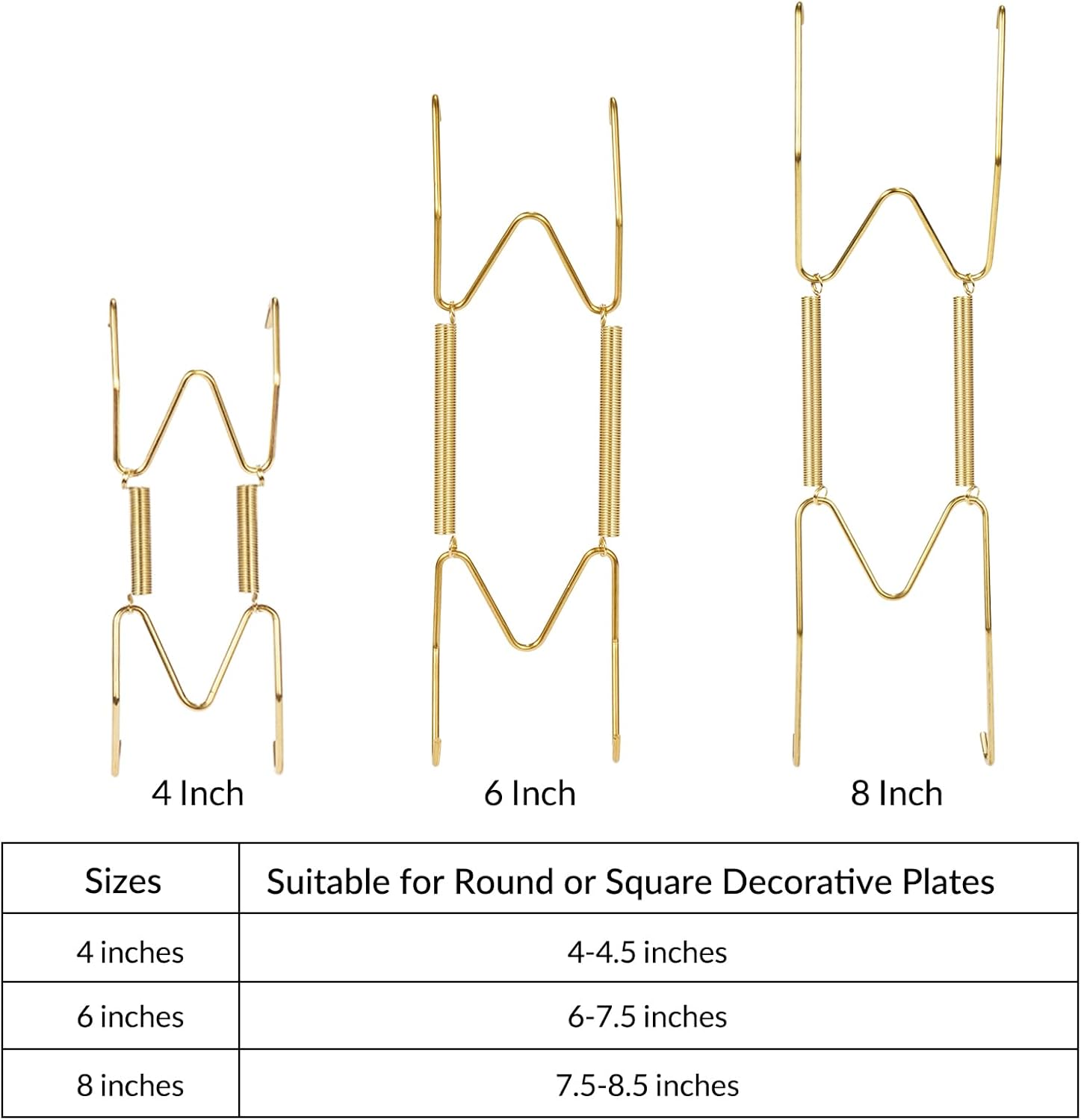 • WELL MADE & VARIOUS SIZES: The plate wall hanger is made of top quality brass with golden color, well-made, not easy to get rust. 4 Inch, fit for holding 4 to 4.5 Inch round or square plates. 6 Inch, fit for holding 6 to 7.5 Inch round or square plates. 8 Inch, fit for holding 7.5 to 8.5 Inch round or square plates.