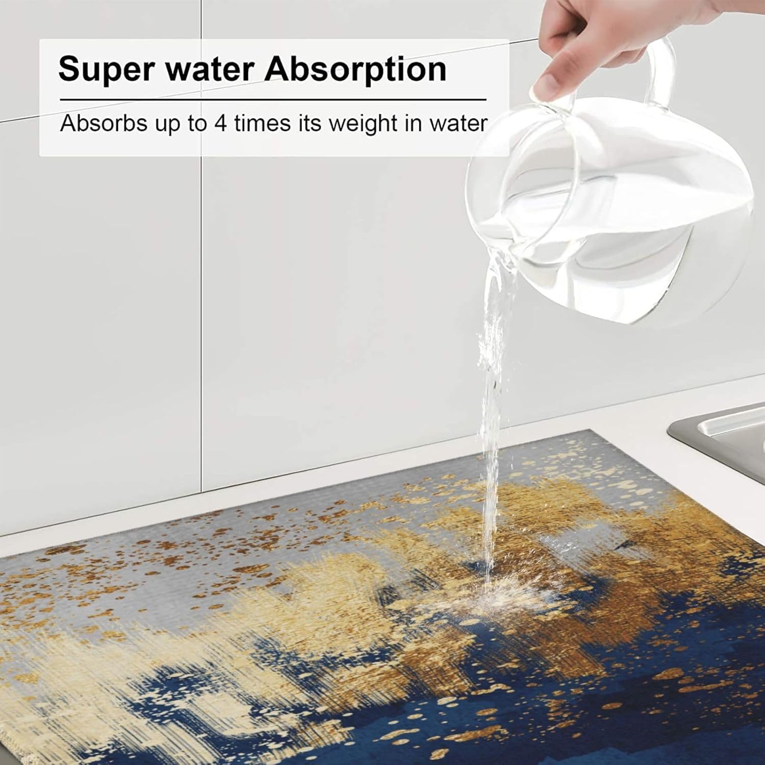 • Luxury Abstract Art Design with Navy Blue & Gold - Featuring dynamic navy blue and gold abstract patterns with artistic textural details, this decorative drying mat is not just a functional dish drying pad for kitchen counter but also a luxury modern kitchen mat that brings a touch of high-end art to your sink, dining area, and home decor
