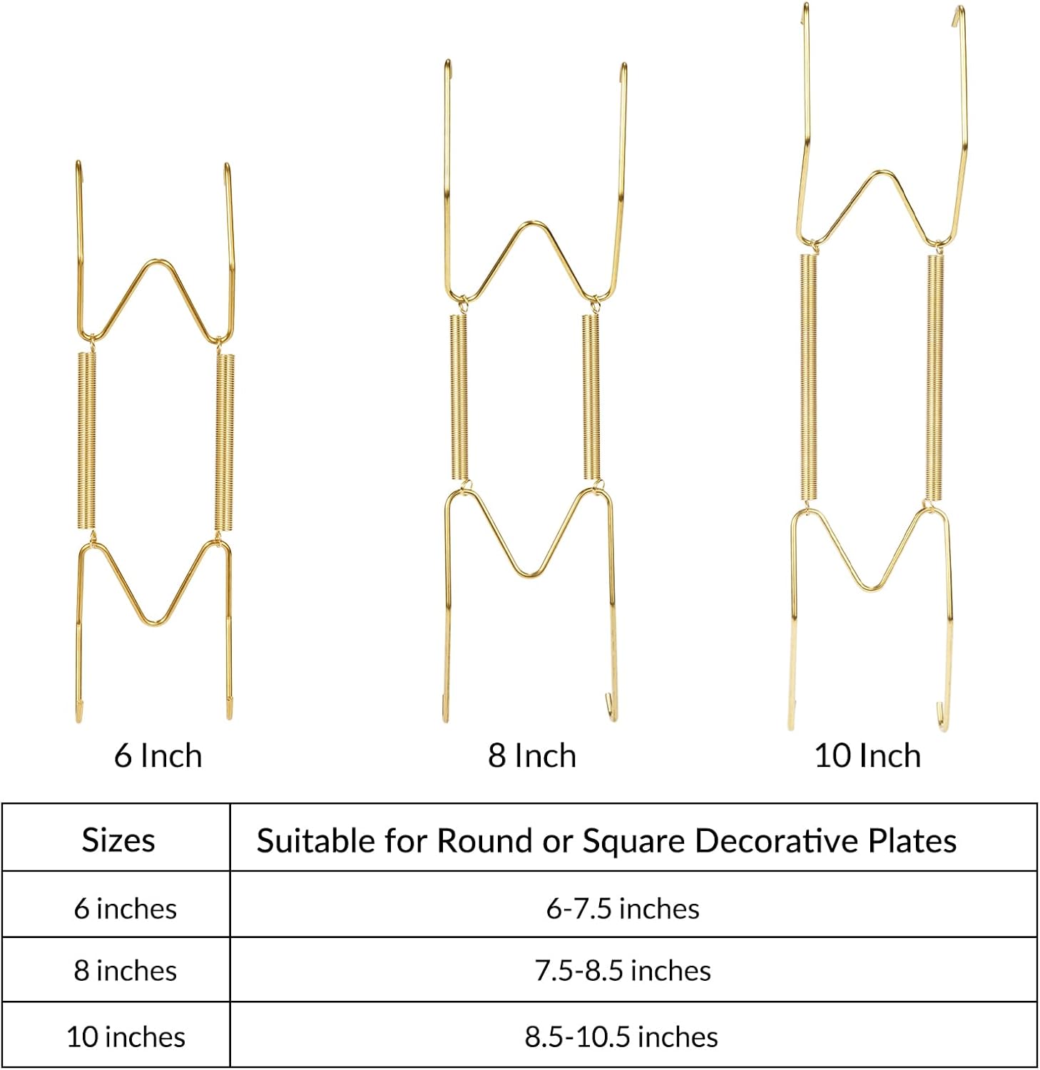 • WELL MADE & VARIOUS SIZES: The plate wall hanger is made of top quality brass with golden color, well-made, not easy to get rust. 6 Inch, fit for holding 6 to 7.5 Inch round or square plates. 8 Inch, fit for holding 7.5 to 8.5 Inch round or square plates. 10 Inch, fit for holding 8.5 to 10.5 Inch round or square plates.