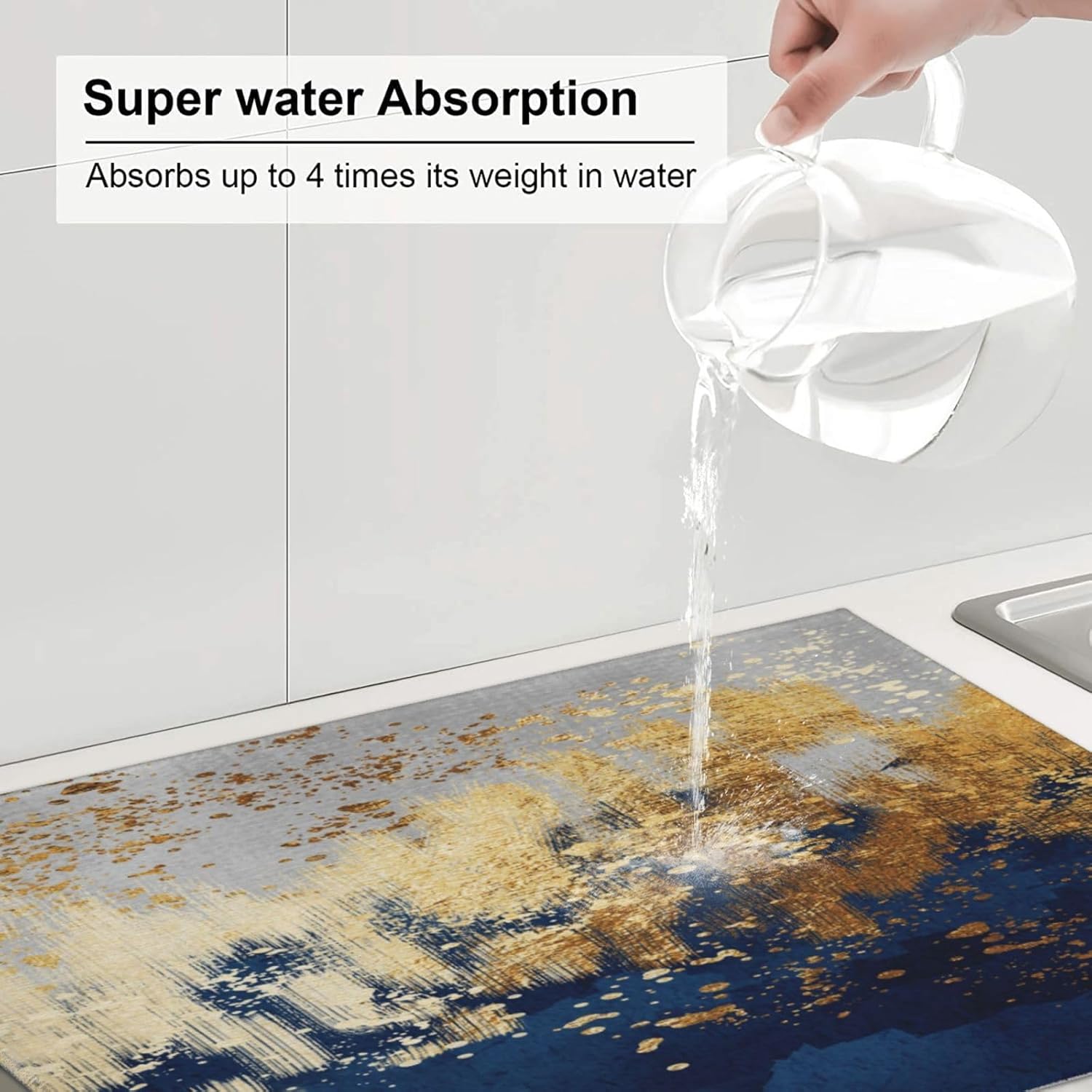 • Luxury Abstract Art Design with Navy Blue & Gold - Featuring dynamic navy blue and gold abstract patterns with artistic textural details, this decorative drying mat is not just a functional dish drying pad for kitchen counter but also a luxury modern kitchen mat that brings a touch of high-end art to your sink, dining area, and home decor
