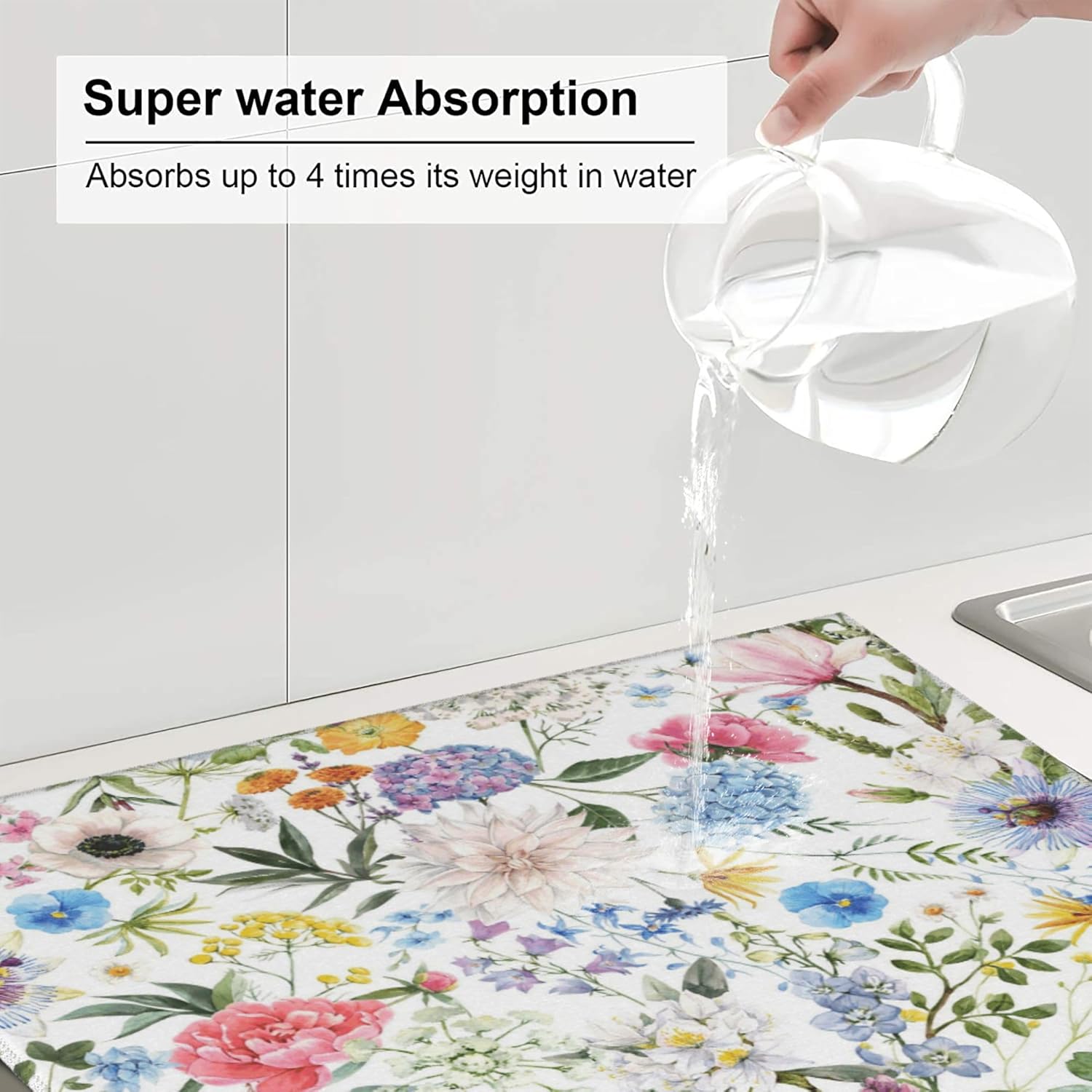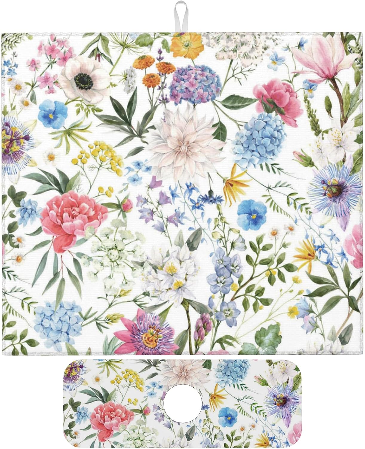 Colorful Flowers Dish Drying Mat for Kitchen Counter, 16"x18" Microfiber Absorbent Fast Dry Mat, 2Pcs Dish Mat Faucet Mats Sets, Large Drying Kitchen Mat Kitchen Drying Pad Coffee Bar Decor Gifts