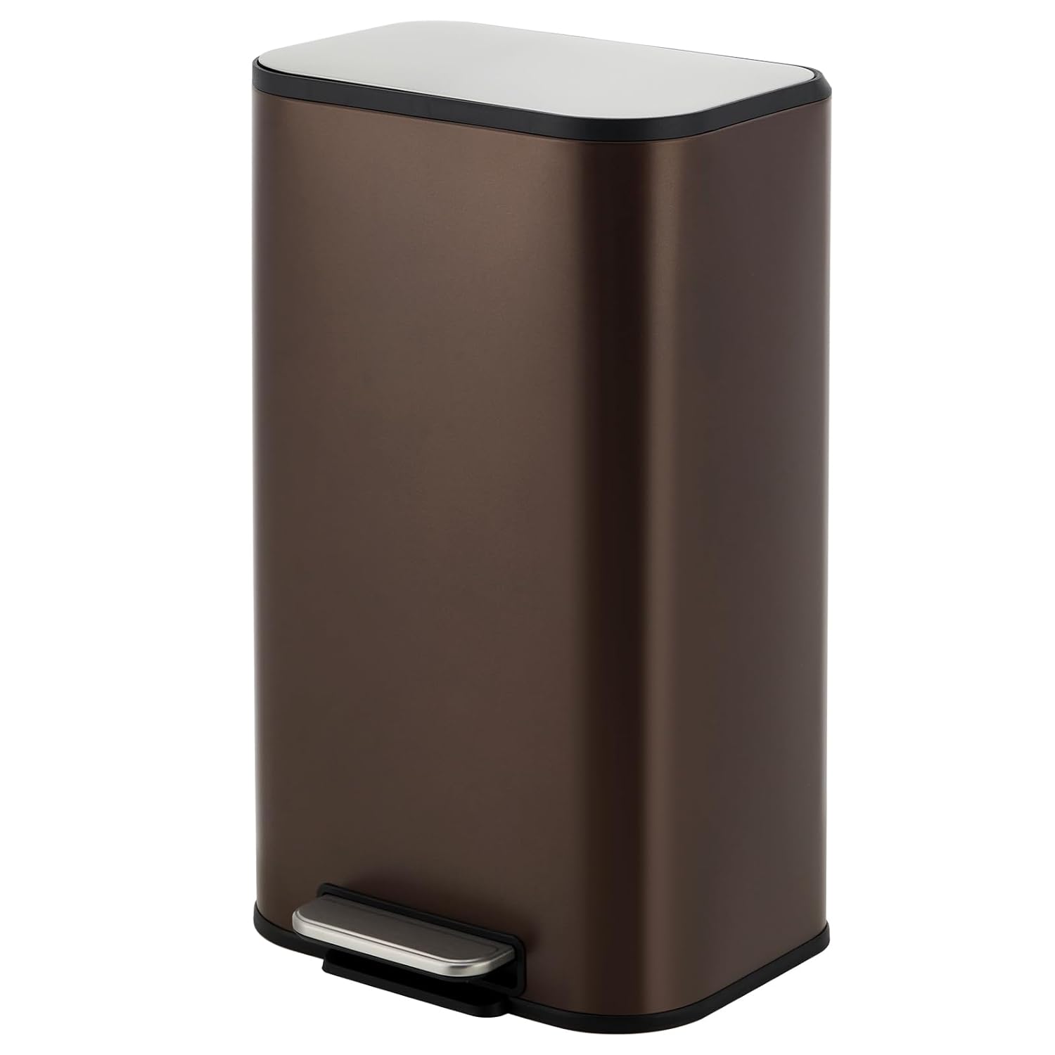 8 Gallon Trash Can for Kitchen, Stainless Steel Garbage Can with Soft-Close Lid, Rectangular Trash Can with Step-On Pedal and Inner Bucket for Home Office Bathroom Living Room, Brown