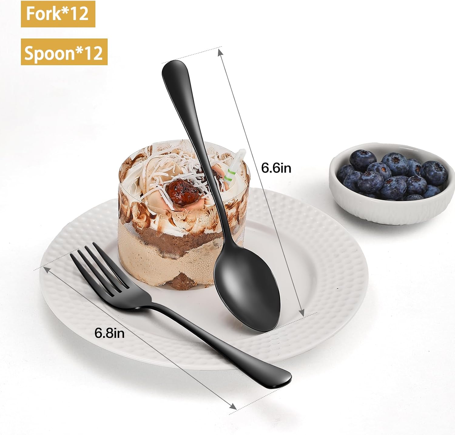 • 【Spoons and Forks Set】 This set includes 12 black forks (6.8 inches) and 12 black spoons (6.6 inches). The edges have been meticulously polished and are so smooth that they won't scratch your mouth. Crafted from stainless steel, these black utensils are perfect for daily home use, handling everything from dessert, salad, and pasta to fruit and a variety of other foods. They also add a touch of modern elegance to your table, making any dinner or party feel more stylish.