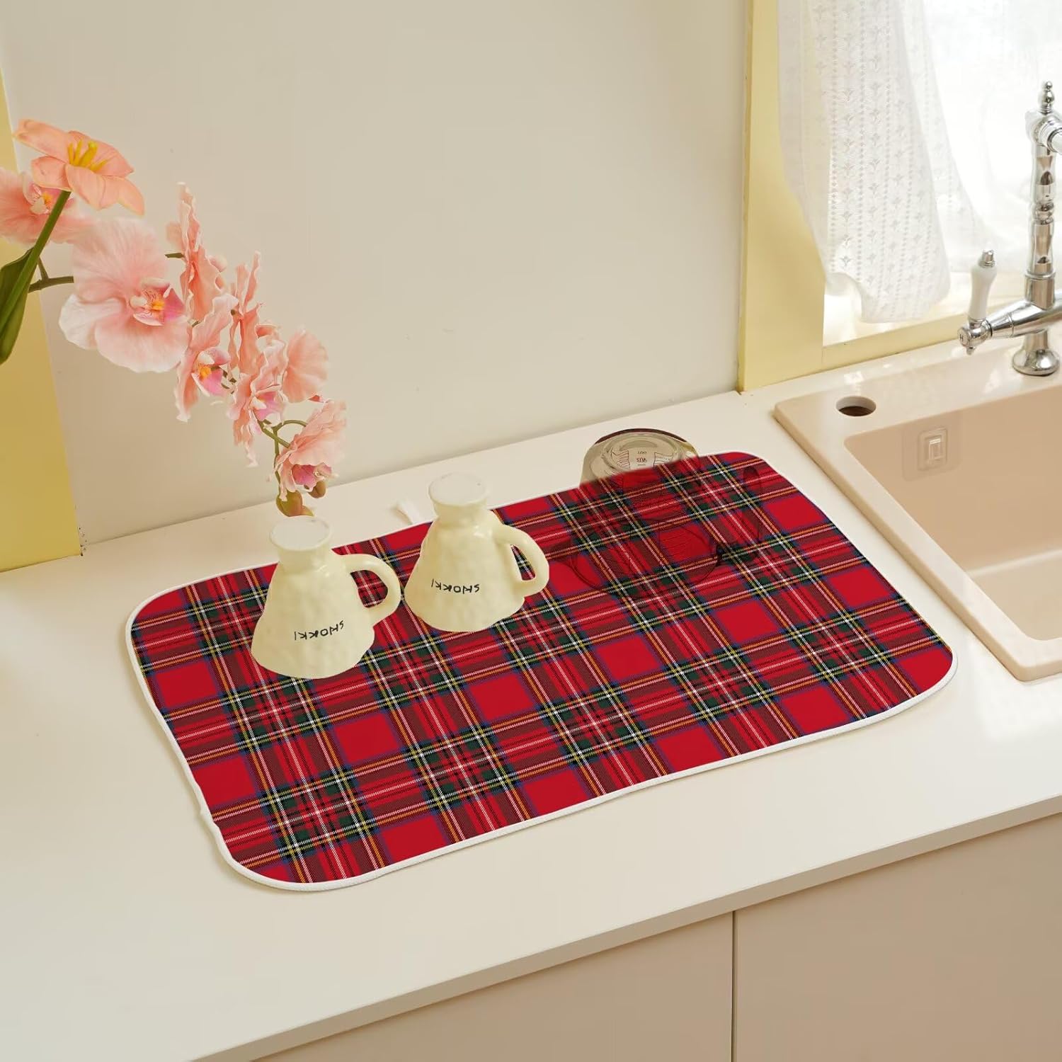 Christmas Dish Drying Mat 18 x 24 inch Red Buffalo Plaid Decorative Drying Mats Microfiber Absorbent Xmas Holiday Dish Washable Draining Mat for Kitchen Counter Decor