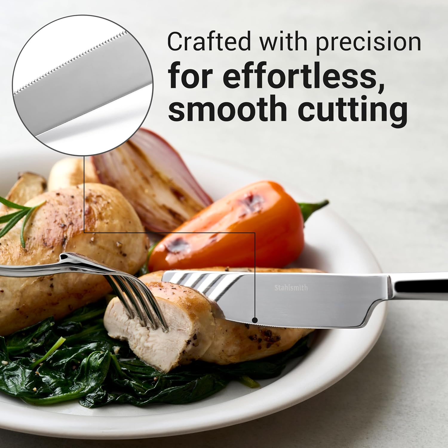• Timeless Style with Mirror Finish: From the precisely serrated dinner knife to the versatile spoons and forks set, every detail showcases expert craftsmanship. The sleek mirror finish and timeless design pair beautifully with any kitchen and dining set, making this cutlery set perfect for both casual meals and special occasions.