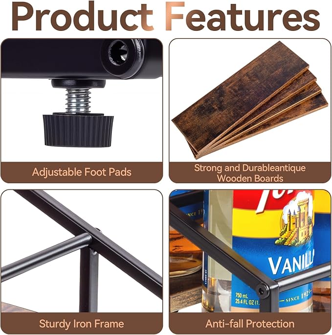 • ·【Stylish and Functional Design】✨ - Easy to Set up, Simple installation; This shelf allows you to read each bottle label and see if any bottle is running low while maintaining perfect equilibrium so your bottles will never be at risk of falling or breaking; Its sleek black metal frame and its design allows it to fit and decorate every type of environment, its hardened durable black iron steel metal fits esthetically in any room.