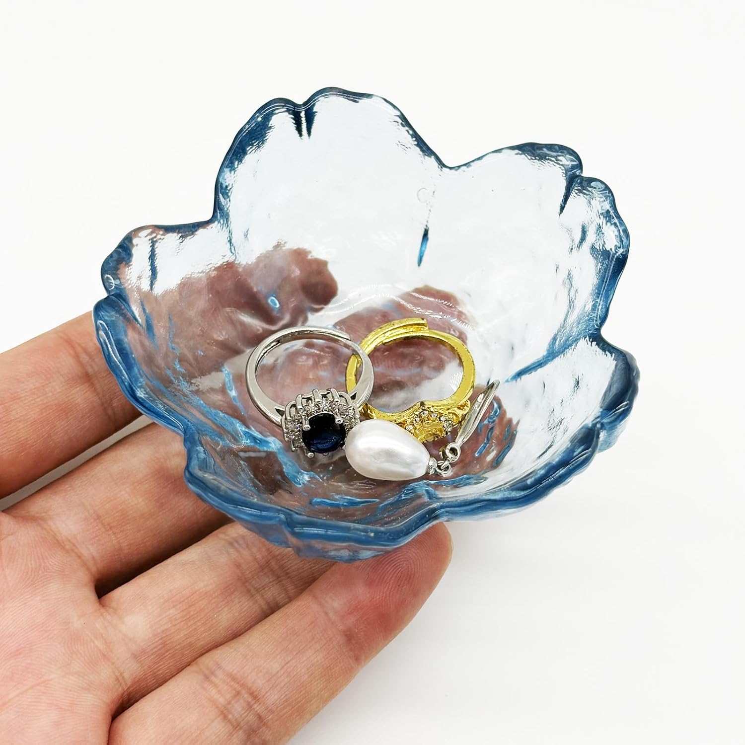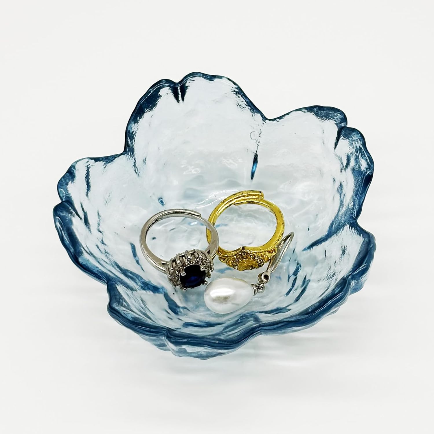 Flower Ring Dish Jewelry Tray, Glass Jewelry Dish Tray, Aesthetic Room Decor Small Trinket Dish, Nightstand Jewlery Ring Holder Dish, Bathroom Jewelry Plate Bowl for Rings Earrings Wife Gift (Blue)