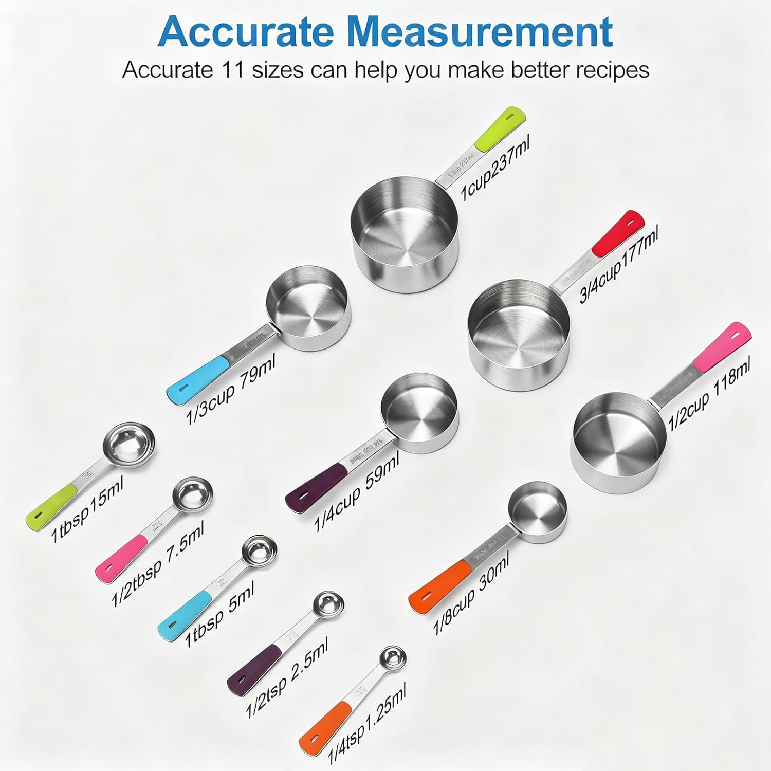 Measuring Cups and Spoons Set, Stainless Steel 11 Piece for Cooking and Baking (6 Cups + 5 Spoons, Colorful Handles)