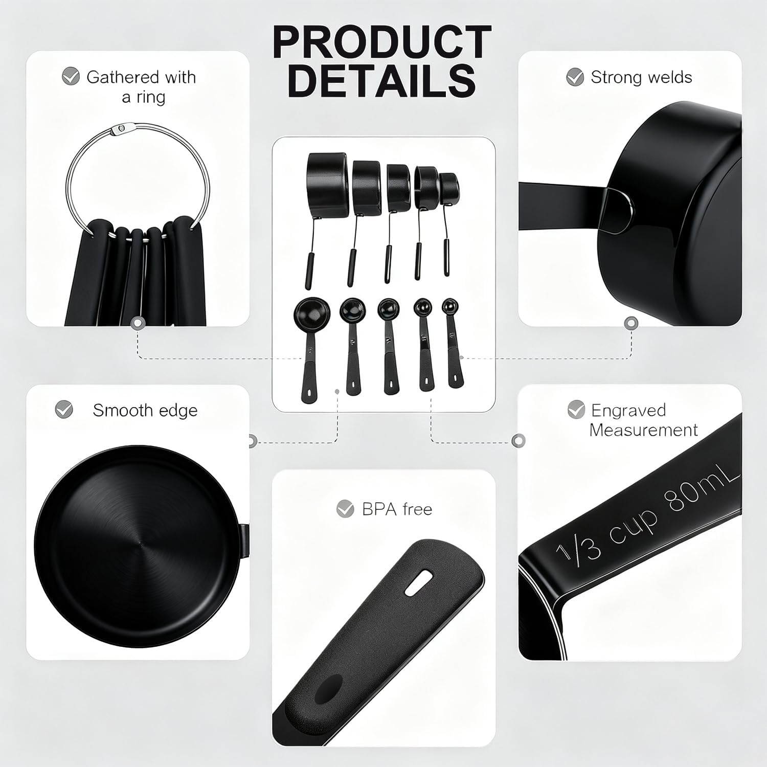• Complete Set – Includes 5 measuring cups (1 Cup, 1/2 Cup, 1/3 Cup, 1/4 Cup, 1/8 Cup) and 5 measuring spoons (1 TBSP, 1/2 TBSP, 1 TSP, 1/2 TSP, 1/4 TSP).