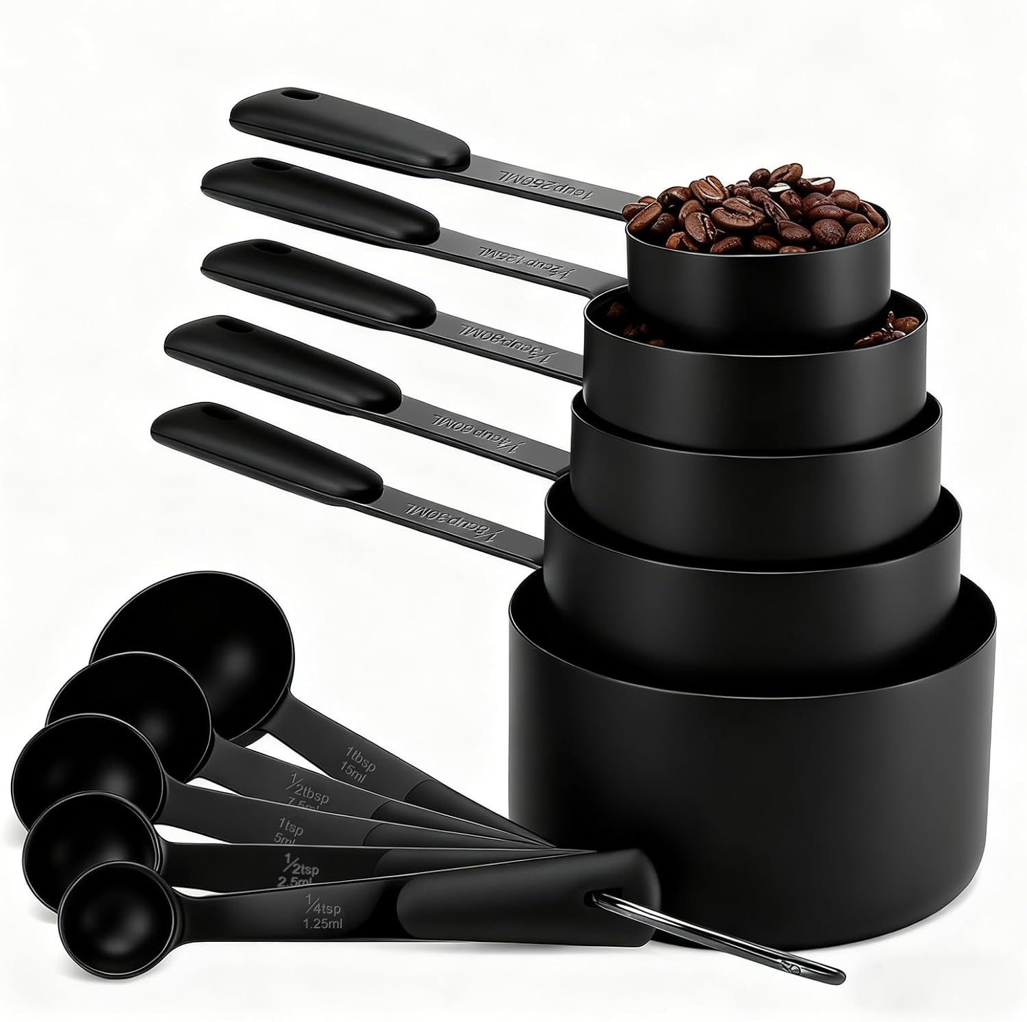 Measuring Cups and Spoons Set, Stainless Steel 10 Piece for Cooking and Baking (5 Cups + 5 Spoons, All Black)