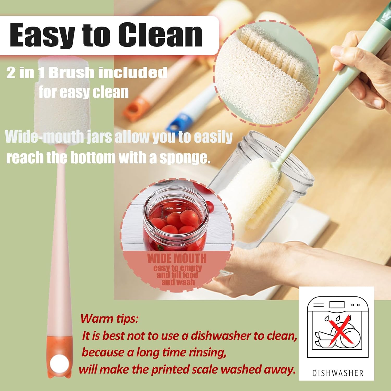 • EASY TO USE: Glass canning jars with wide mouth allows reaching to the bottom, help you fill up, empty and clean easily. In addition, 80 labels allow you to mark the storage contents,dates and the 2 in1 brush allows you to clean corners of the jar